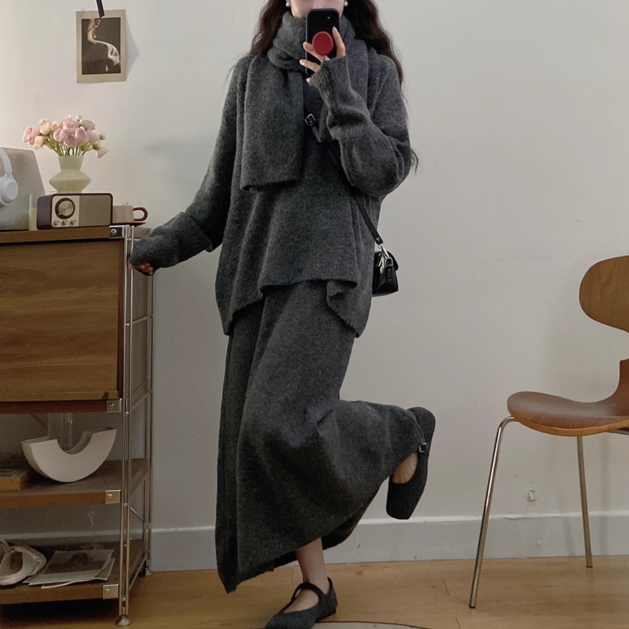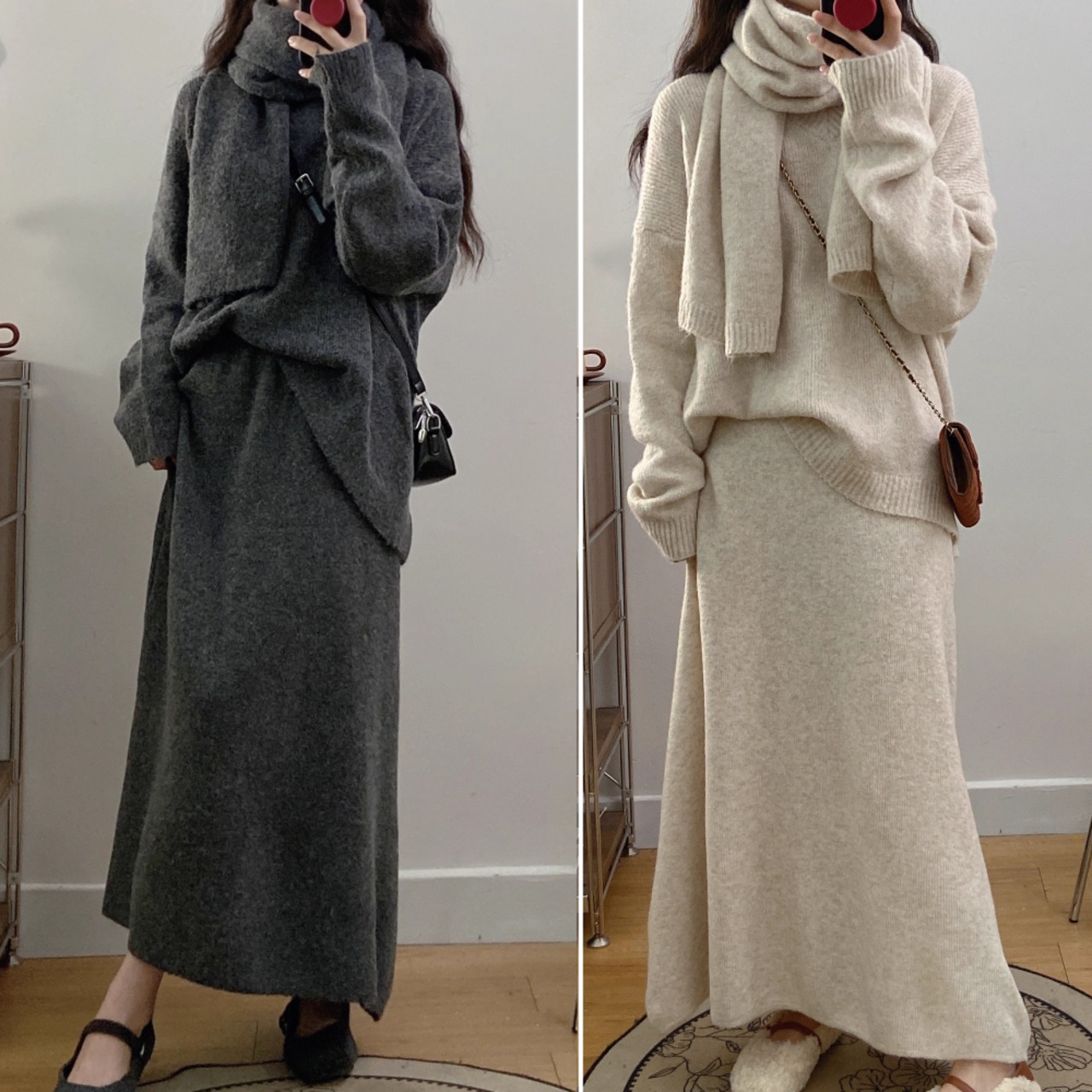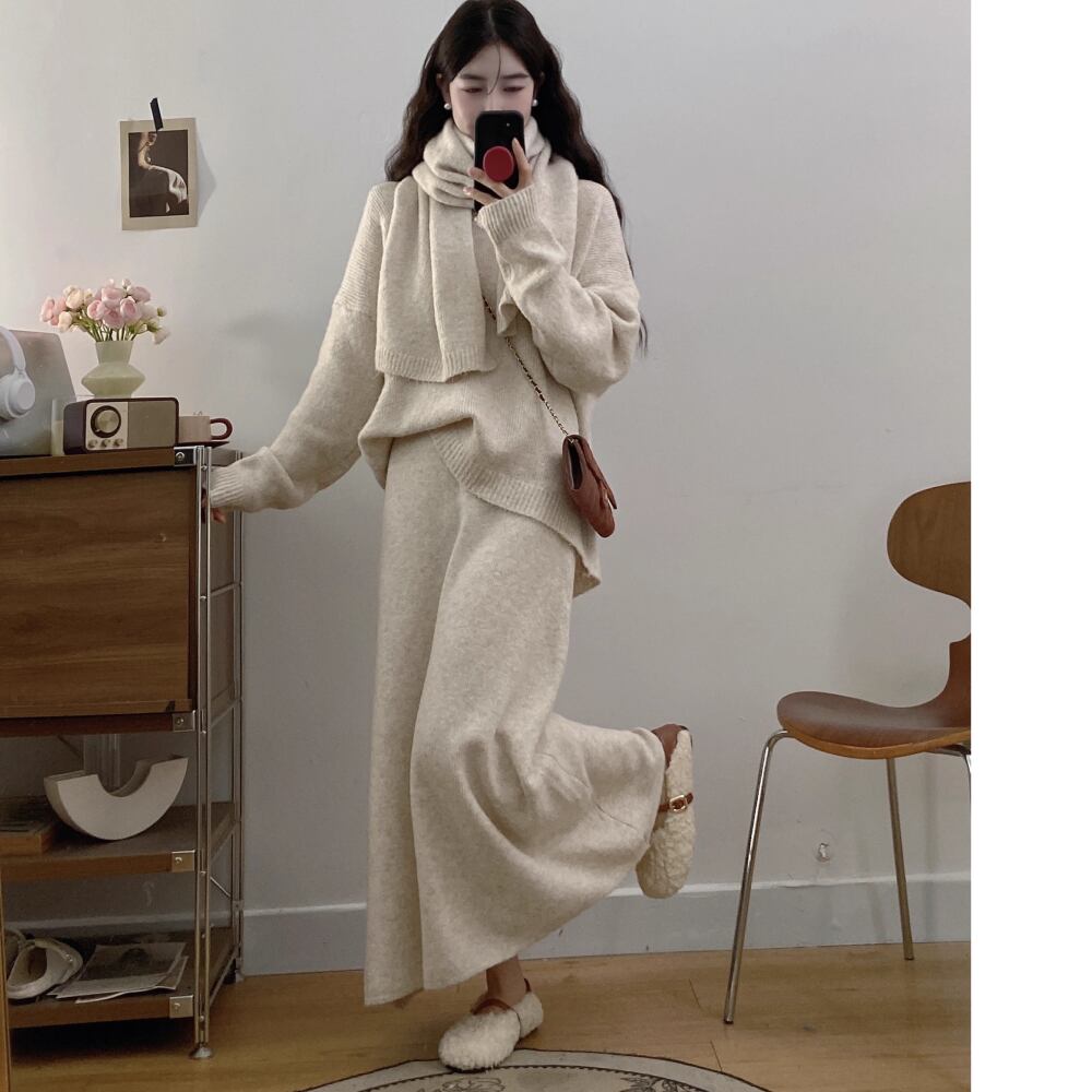 レディース ニット トップス セーター 長袖 スカート マフラー 3点セット AS12659
