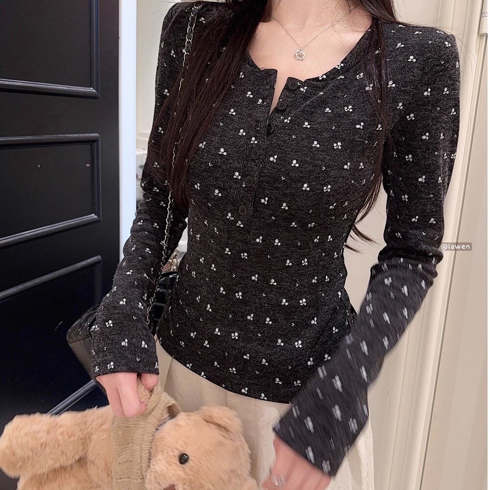 レディース 花柄 トップス 長袖 グレー スリムフィット AS12684