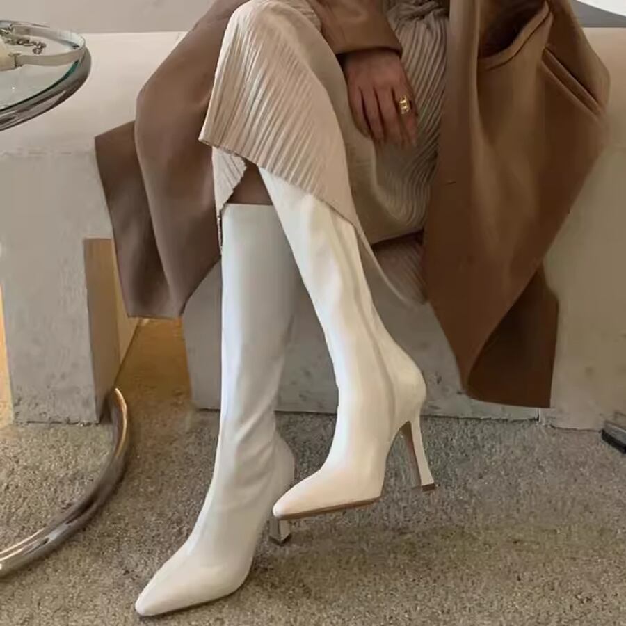 フェイクレザーのロングブーツ。
