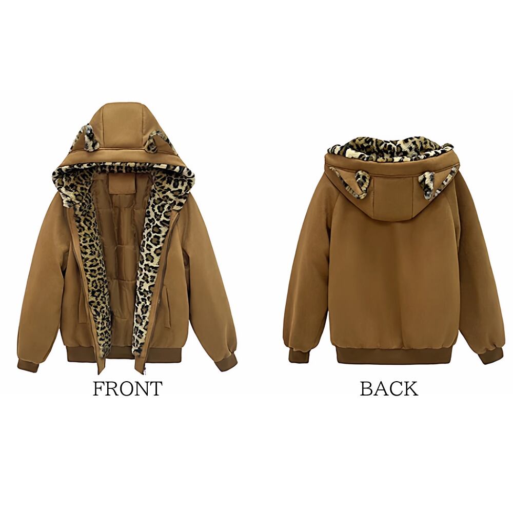 レディース ヒョウ柄 ジャケット 猫耳フード付き ブラウン アプリコット AS12713