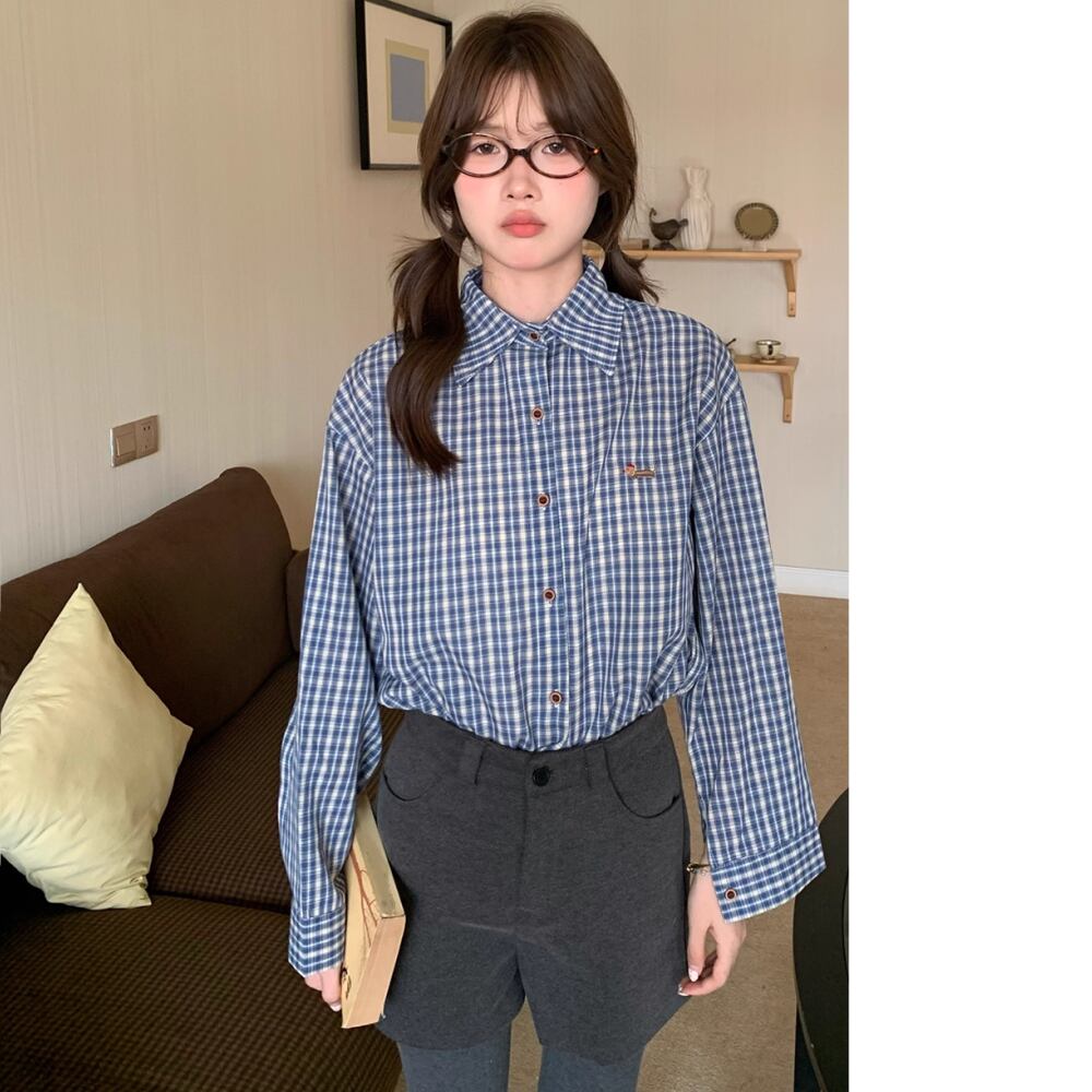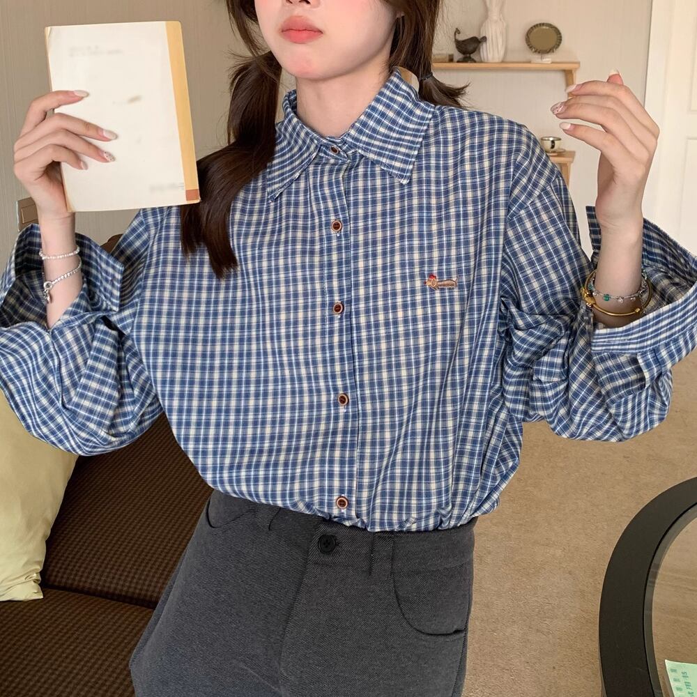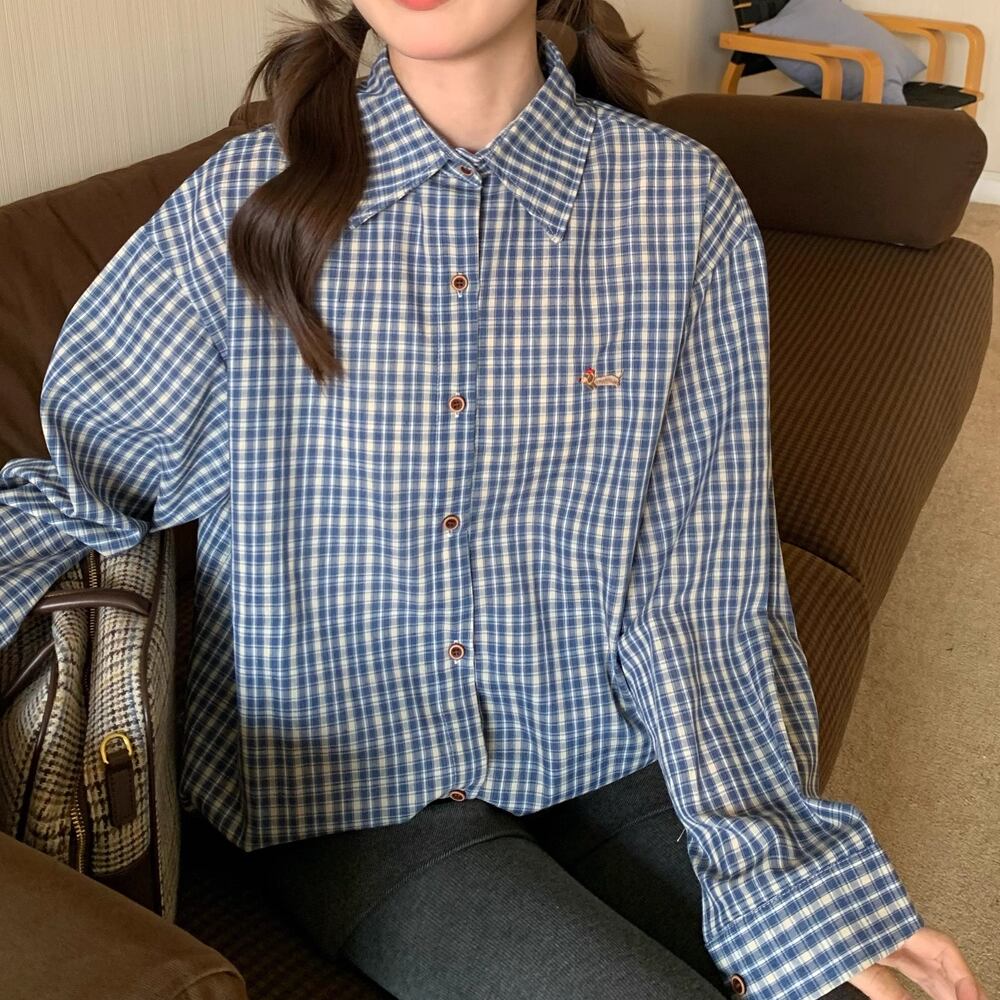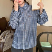 レディース チェック柄 シャツ トップス 長袖 ワンポイント刺繍入り ブルー AS12723