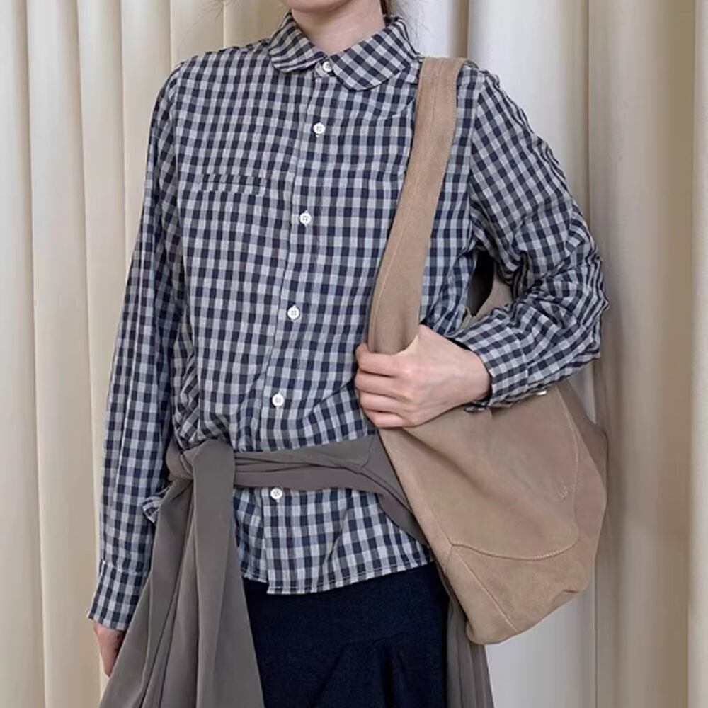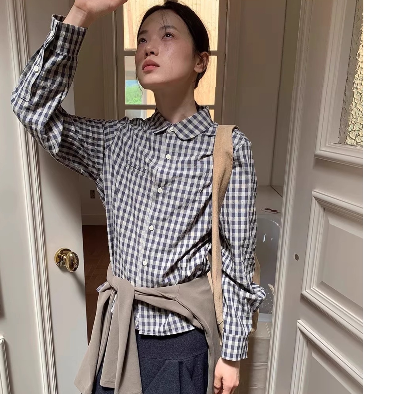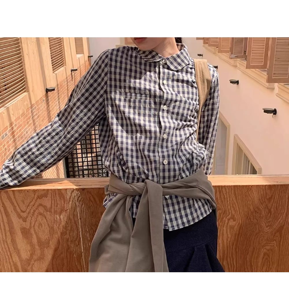 レディース チェック柄 長袖 トップス シャツ 丸襟 ネイビー AS12745