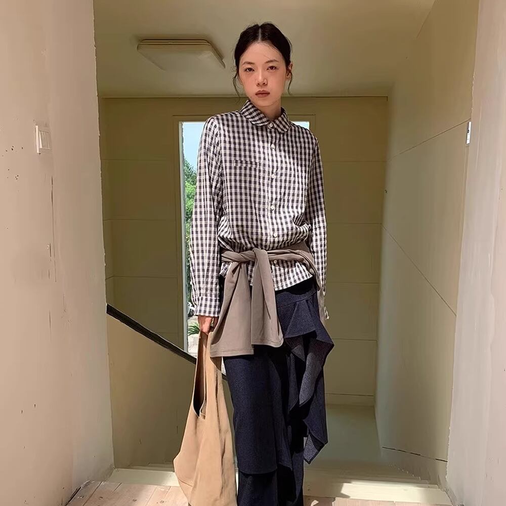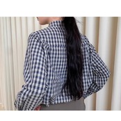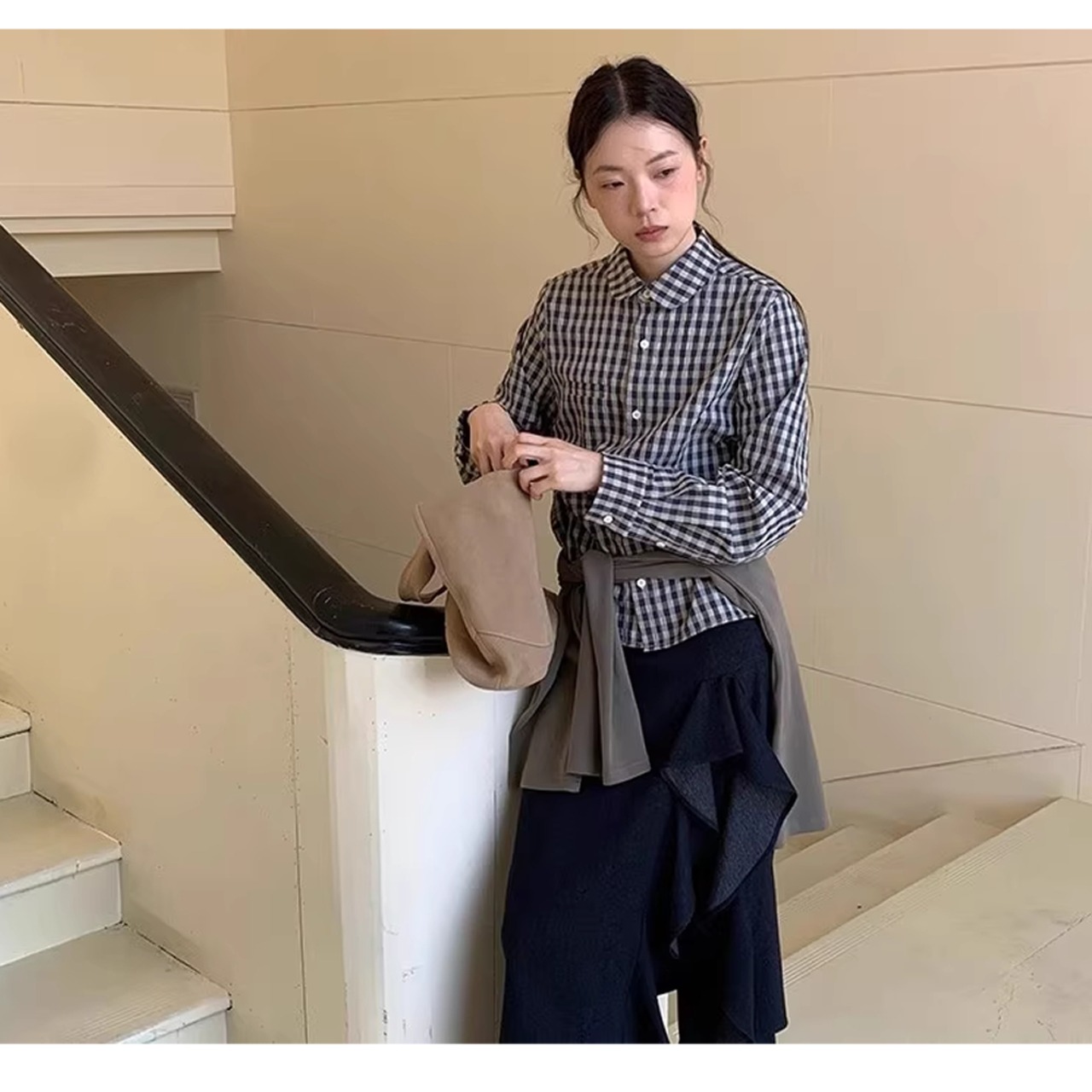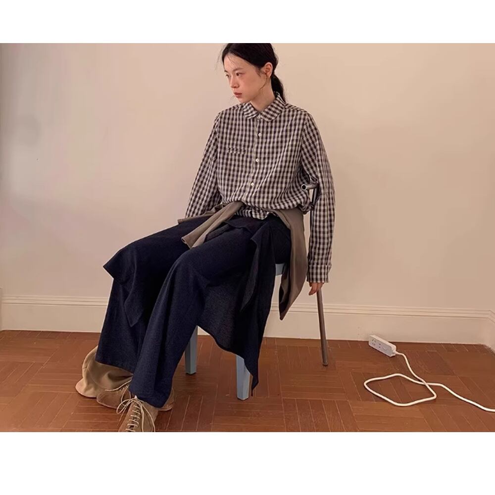 レディース チェック柄 長袖 トップス シャツ 丸襟 ネイビー AS12745