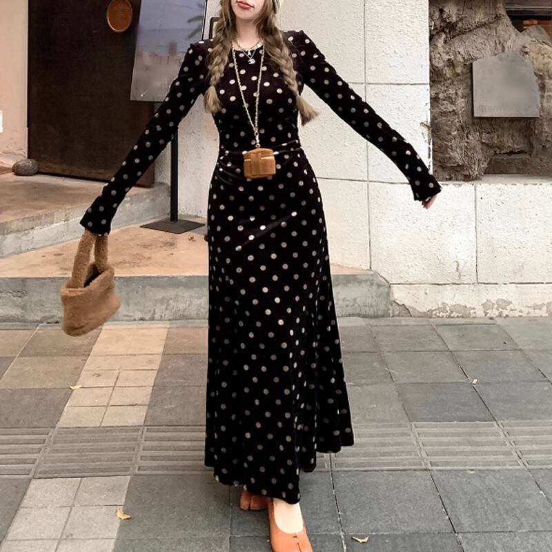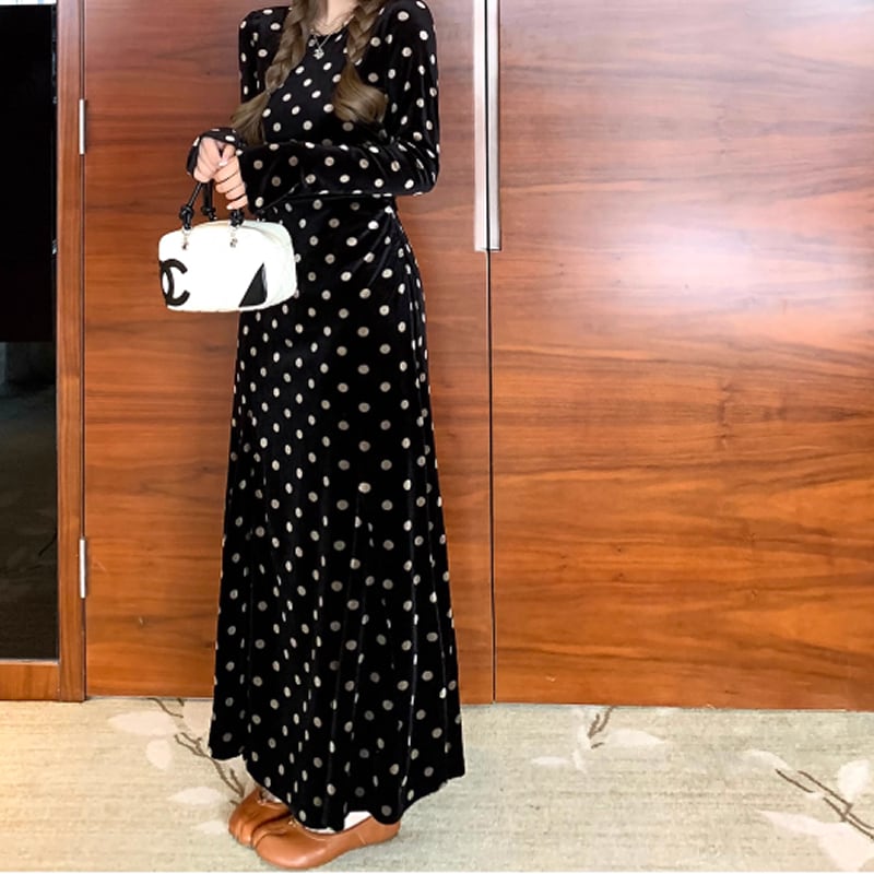 レディース ドット柄 長袖 ロングワンピース ベルベット ブラック AS12778