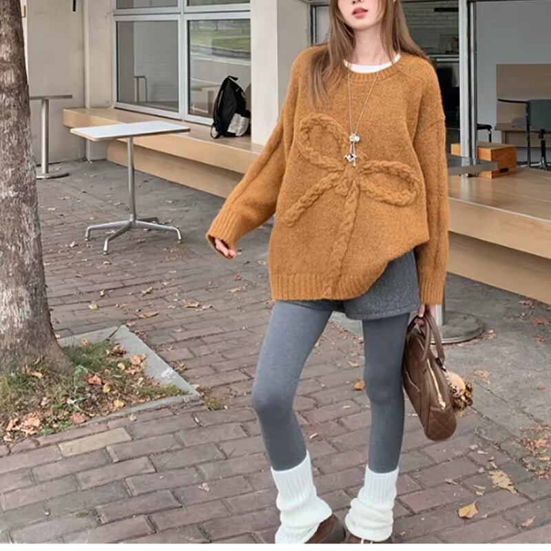 レディース ニット リボン柄 セーター キャメル アプリコット AS12796