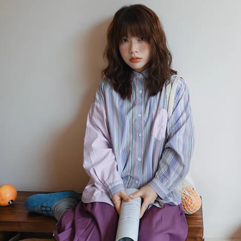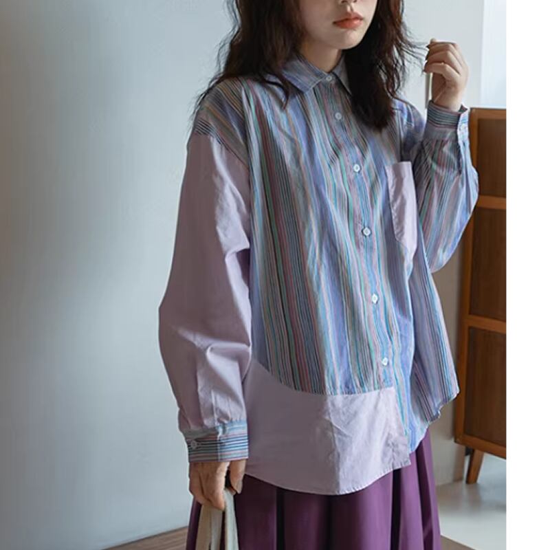レディース ストライプ柄 トップス シャツ 長袖 パッチワークデザイン AS12820