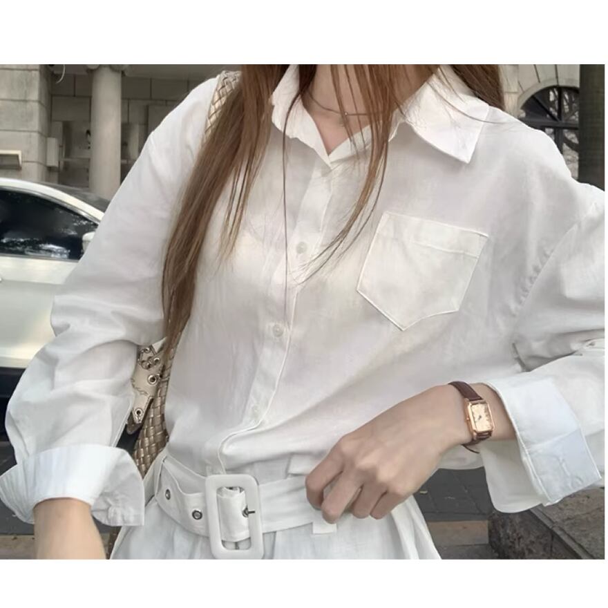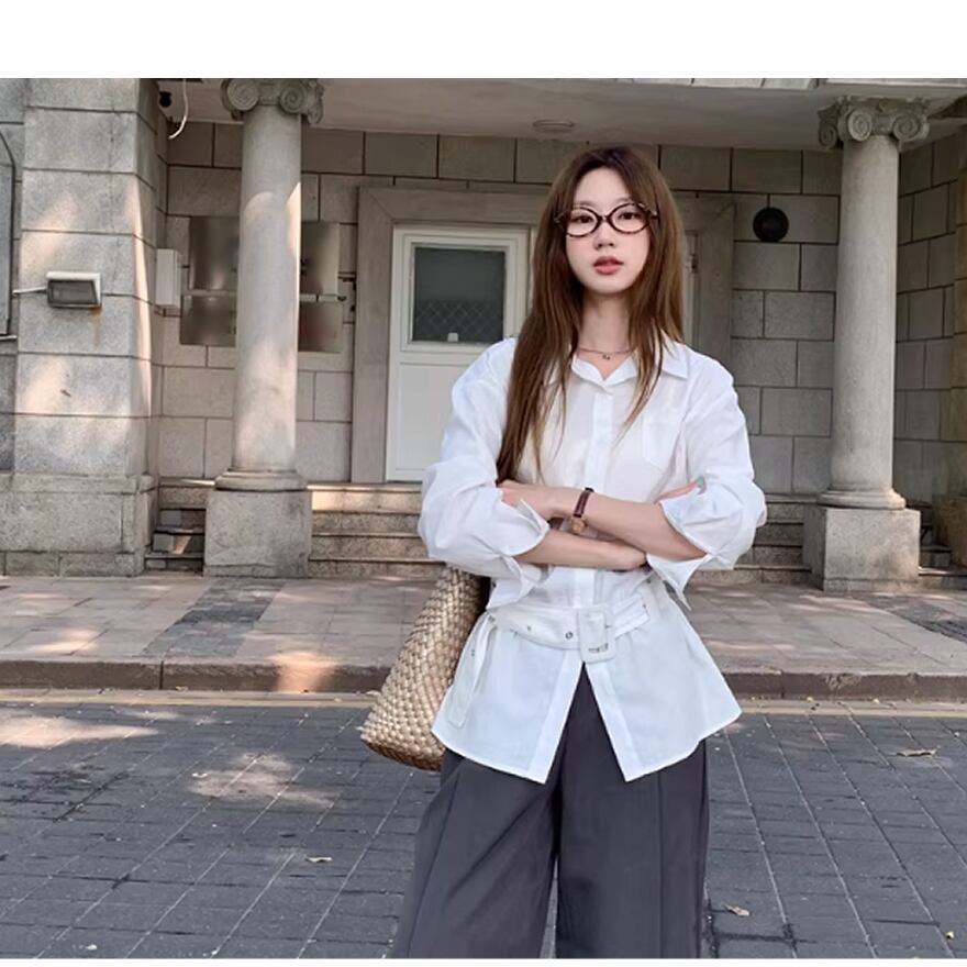 レディース 長袖 トップス シャツ ホワイト ベルト付き AS12833