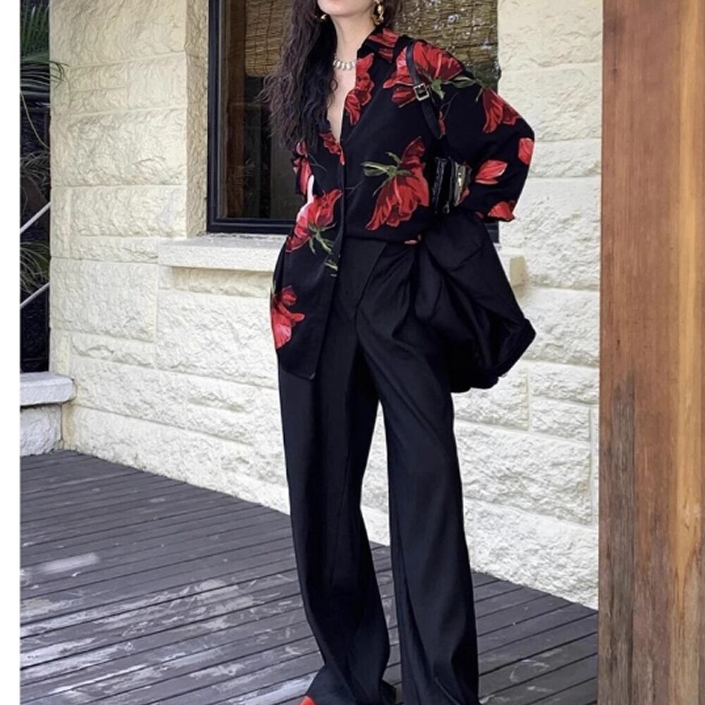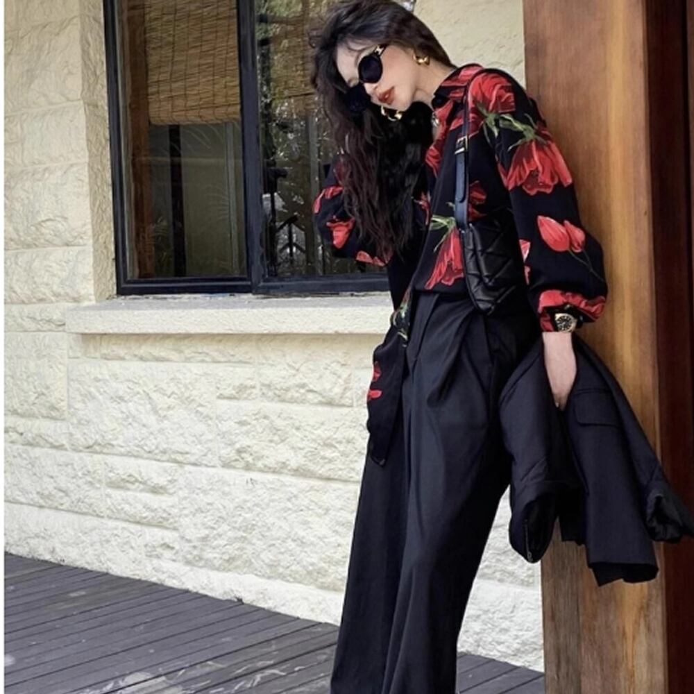 レディース 花柄 長袖 シャツ ブラウス トップス ブラック AS12853