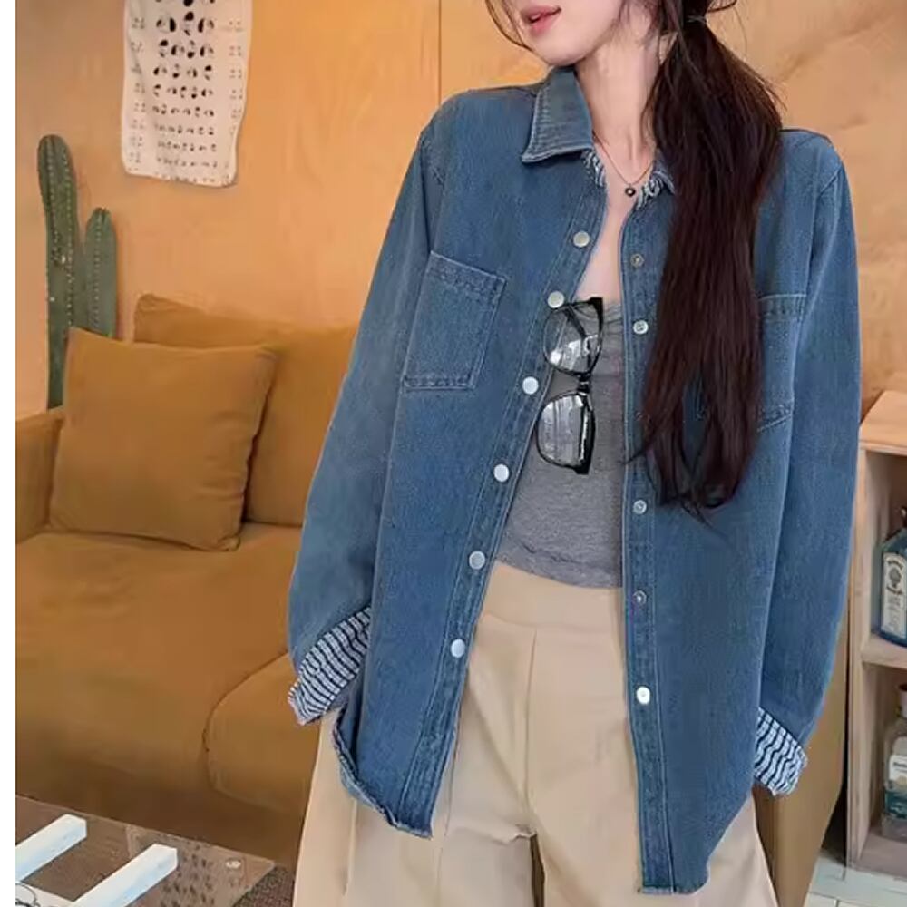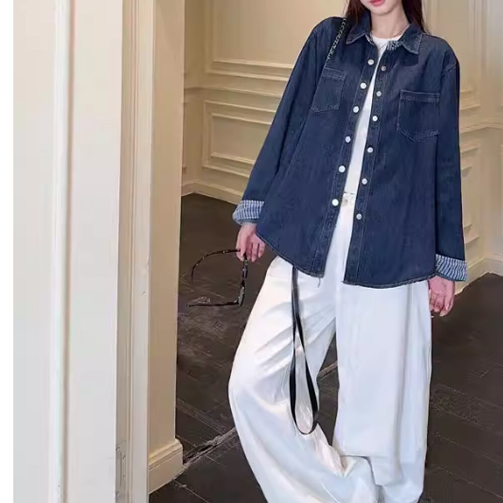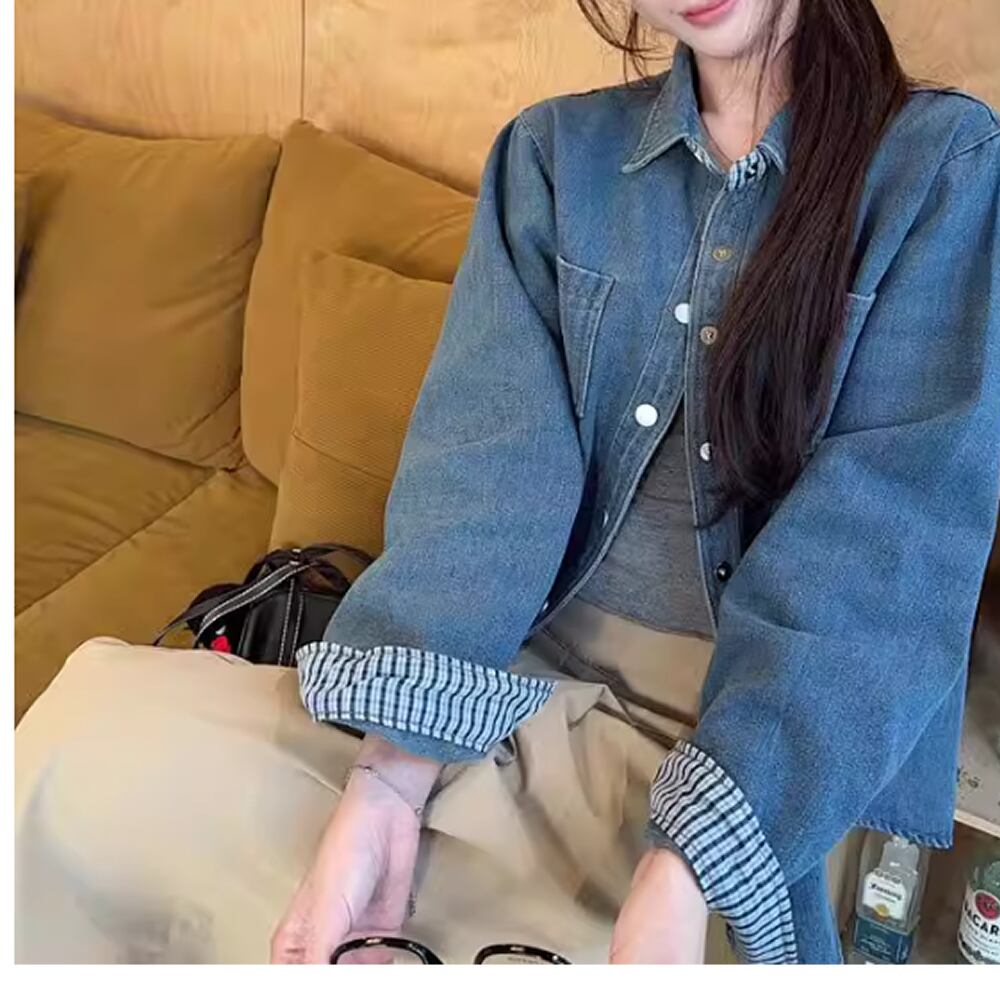 レディース チェック柄切り替え デニムシャツ トップス 長袖 AS12863