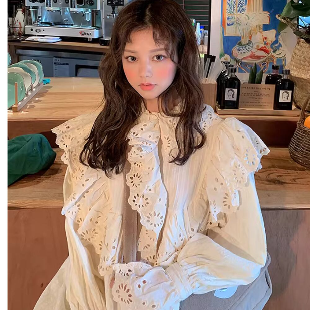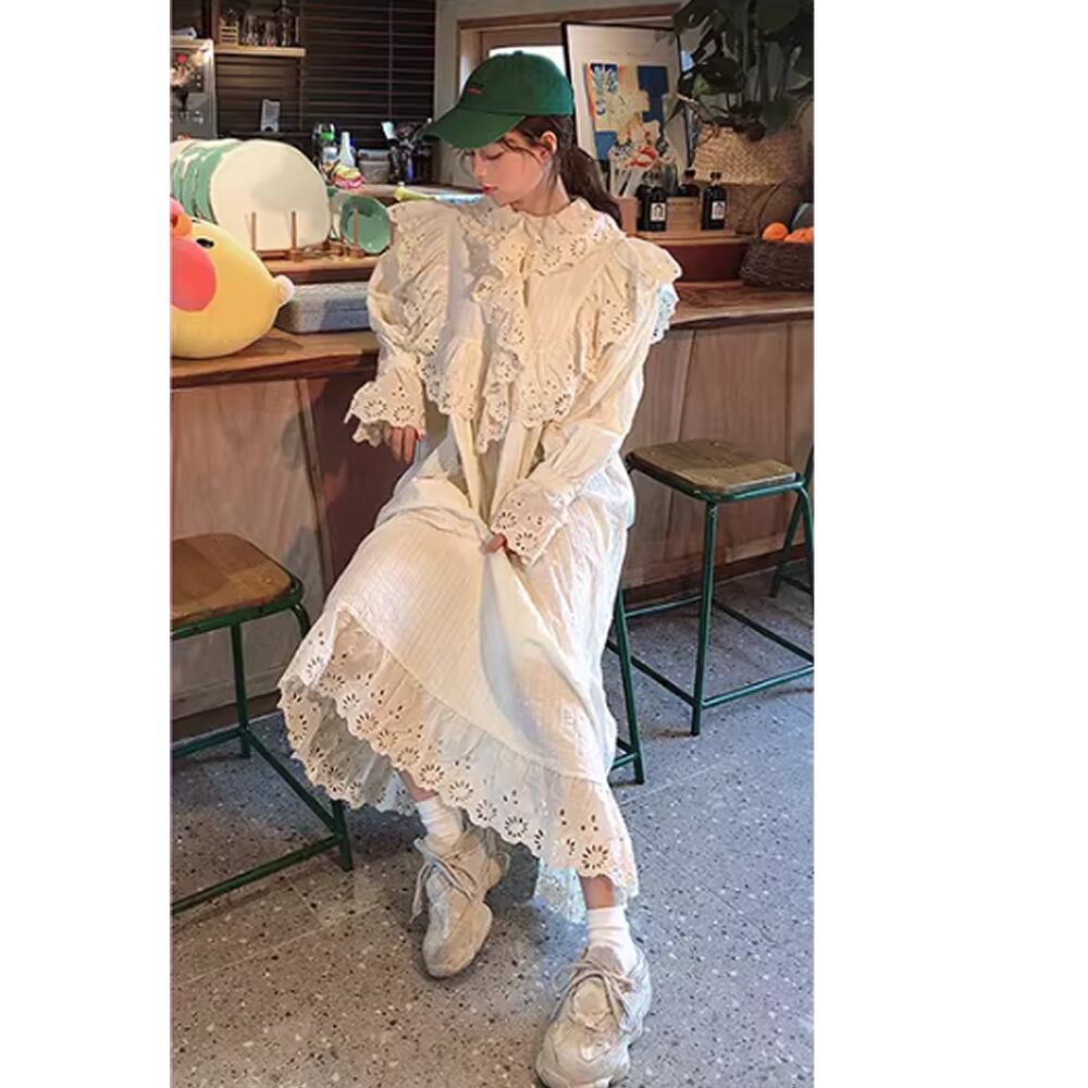 レディース ワンピース ロング丈 長袖 刺繍入りフリル ホワイト AS12873