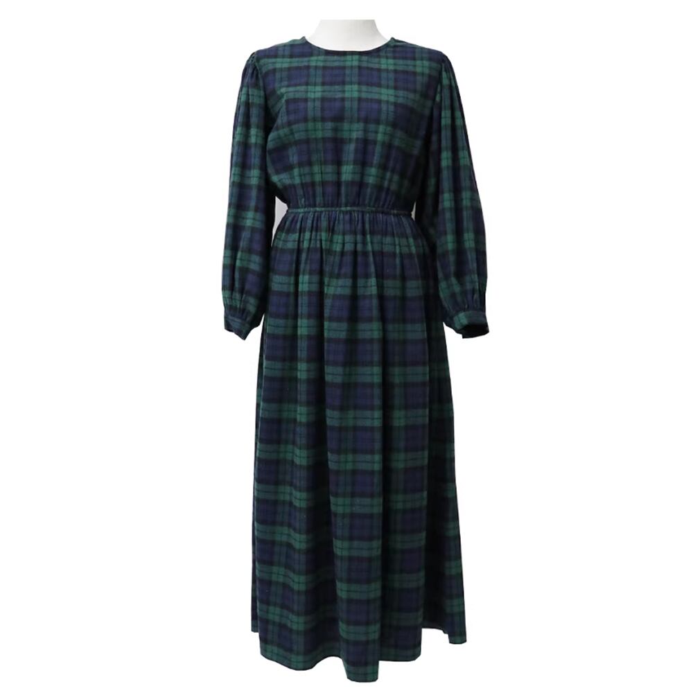 レディース チェック柄 ワンピース 長袖 ロング丈 グリーン AS12879