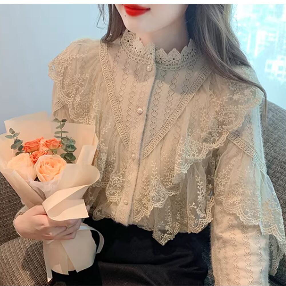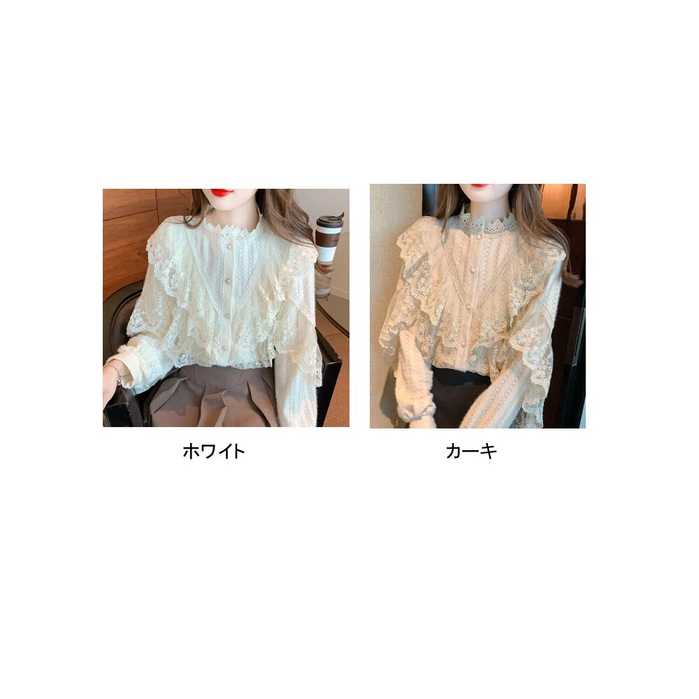 レディース レース トップス 長袖 ブラウス フリル アプリコット カーキ AS12881