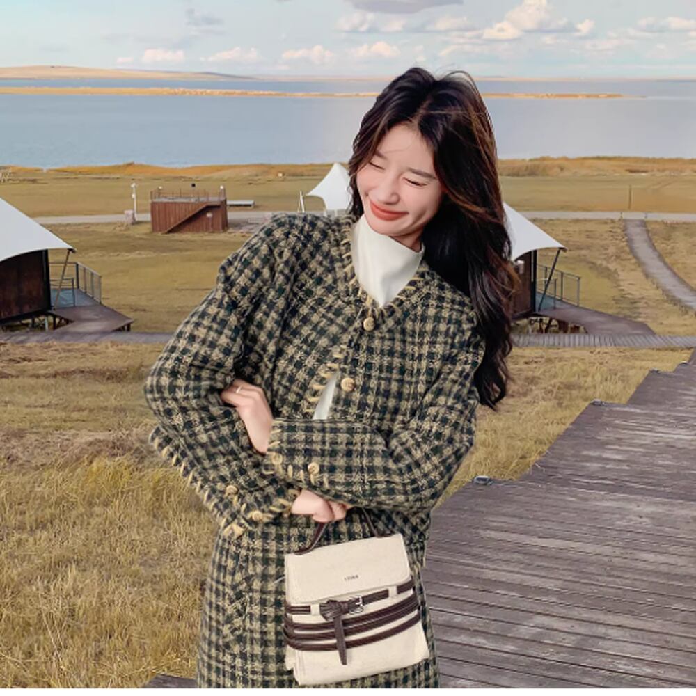 チェック柄のジャケットとスカートのセットアップ。