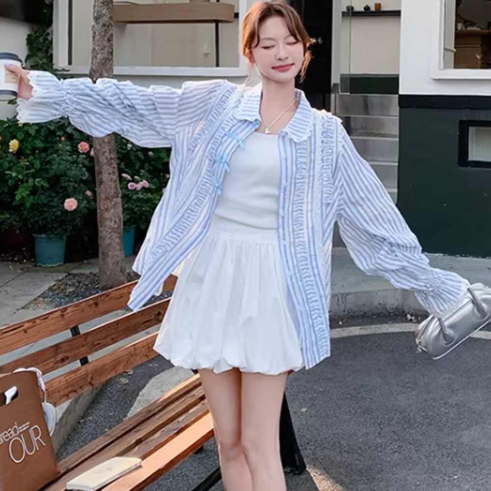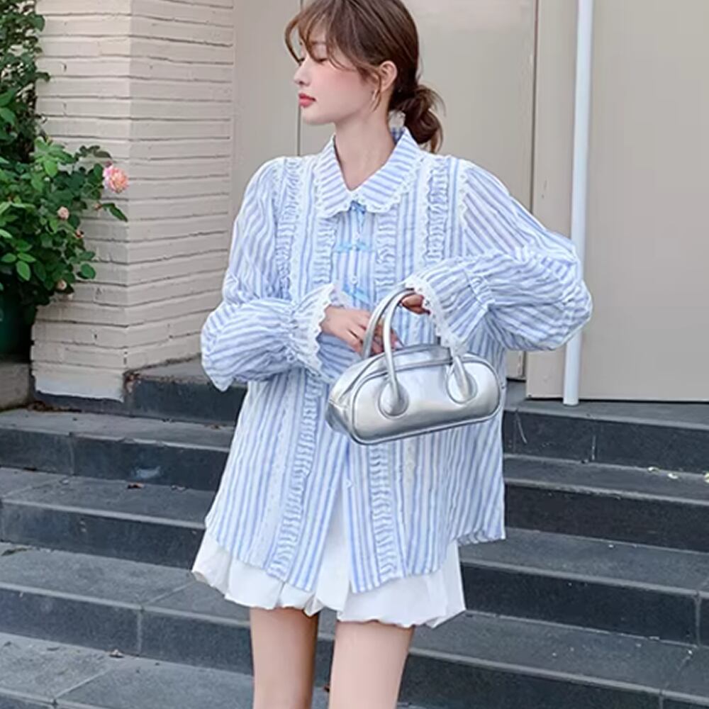 レディース 長袖 トップス シャツ ストライプ柄 フリル リボン ブルー AS12892