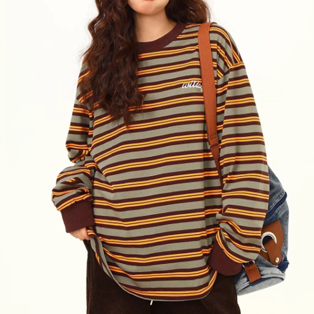 レディース 長袖 トップス Tシャツ 長袖 ボーダー柄 ブラウン ロング丈 AS12894