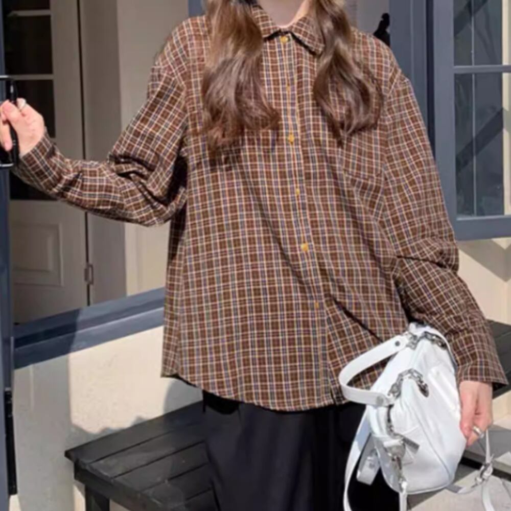 レディース チェック柄 トップス シャツ 長袖 ブラウン AS12918