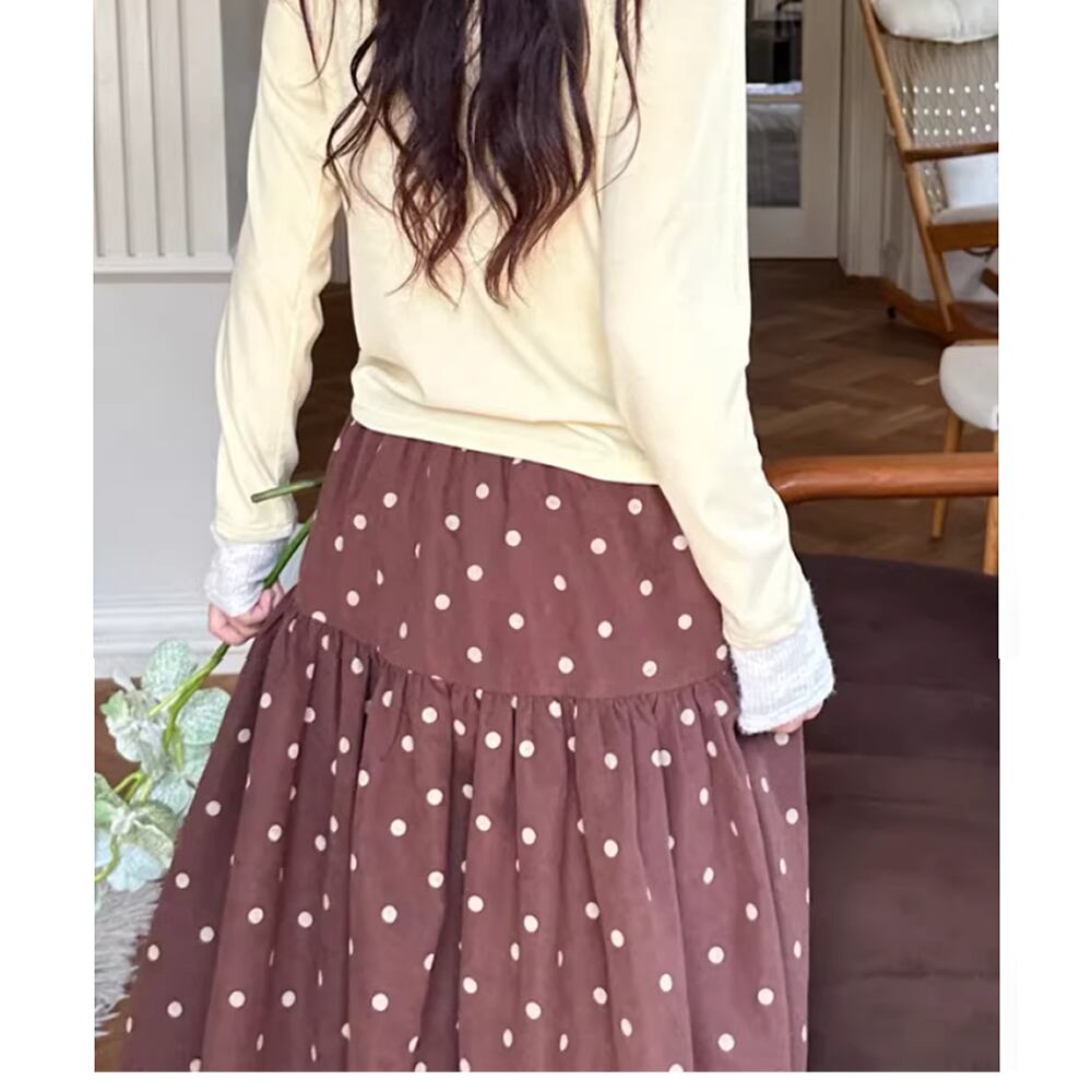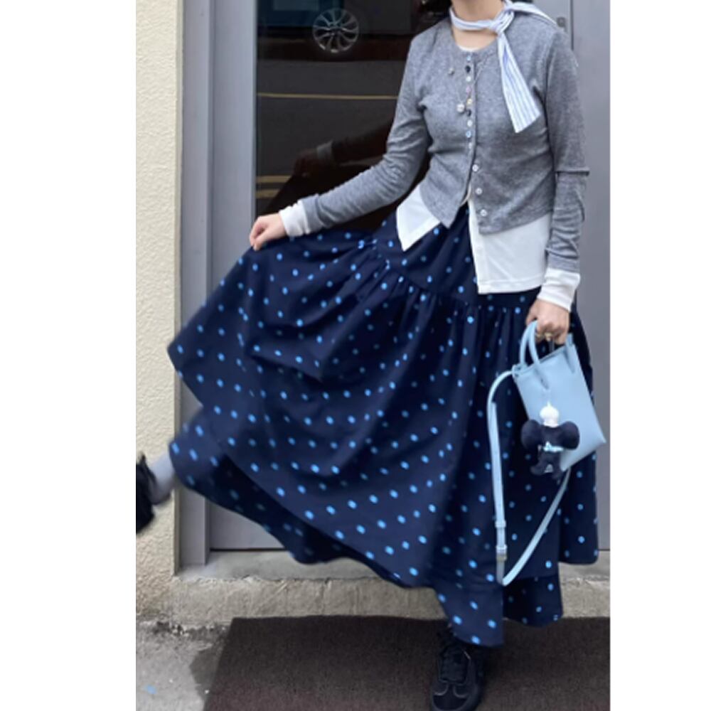 レディース ドット柄 二重 スカート ロング丈 ブラウン ブルー AS12924