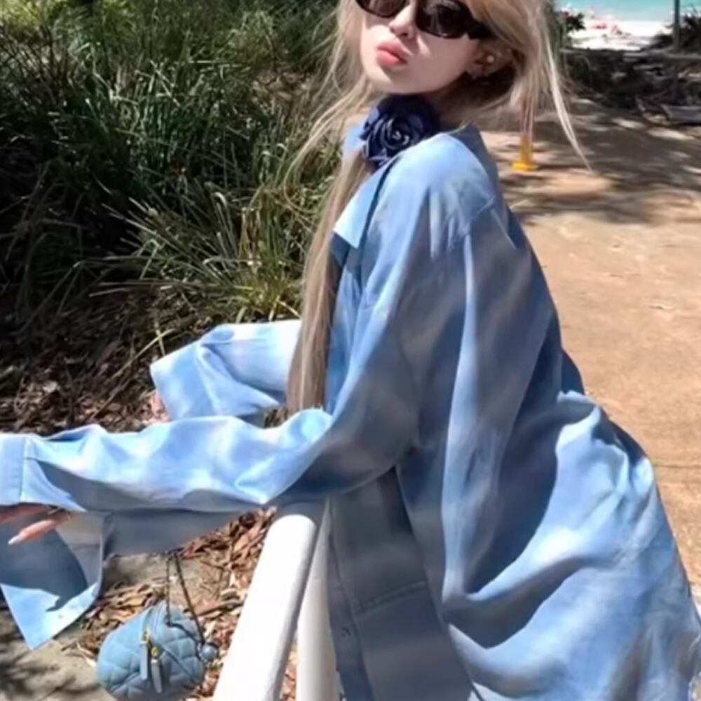 レディース シャツ トップス 長袖 グラデーション ブルー ロング丈 裾ダメージ加工 AS12930