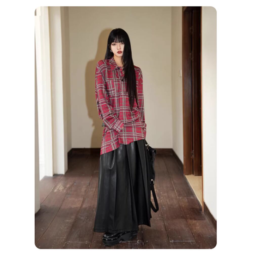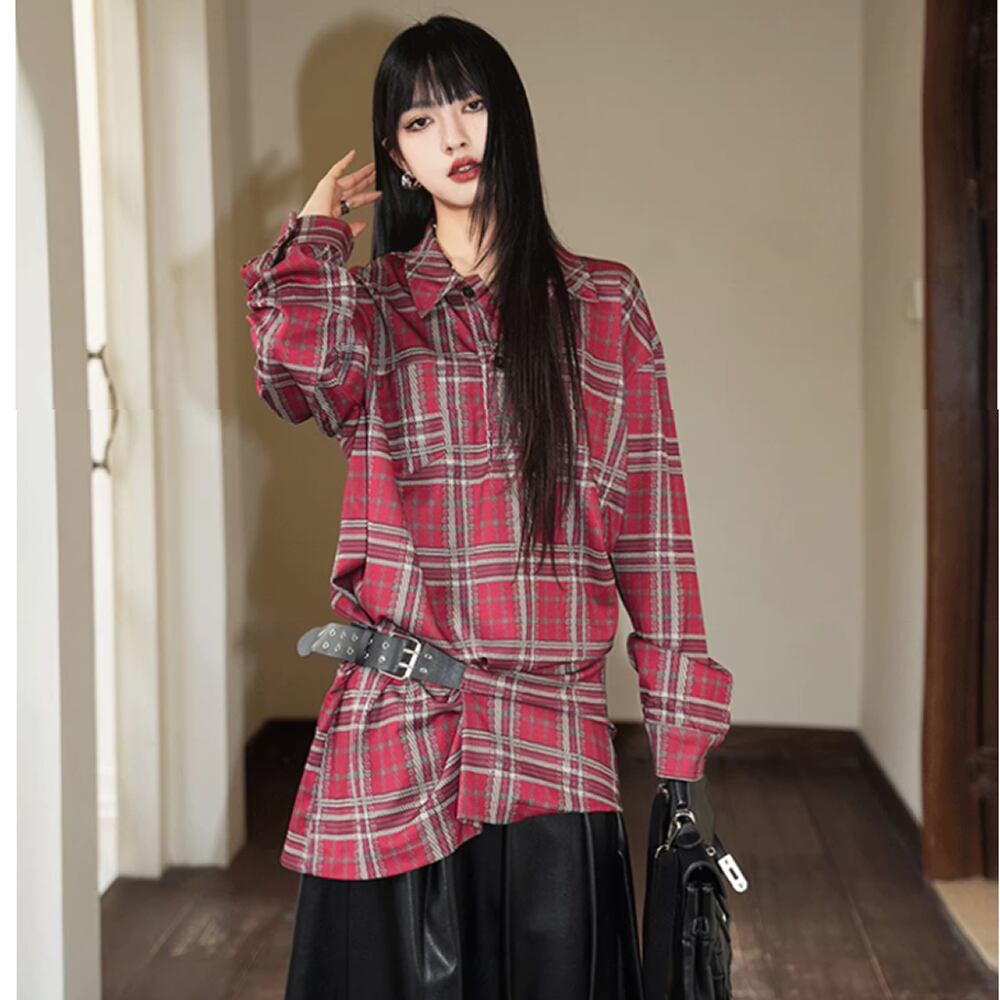 レディース シャツ トップス チェック柄 長袖 レッド ロング丈 AS12947