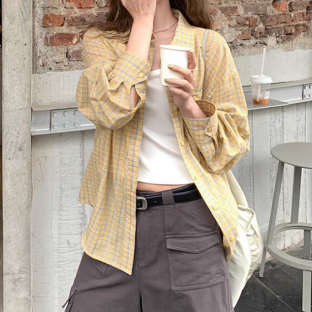 レディース チェック柄 シャツ トップス 長袖 イエロー AS12955