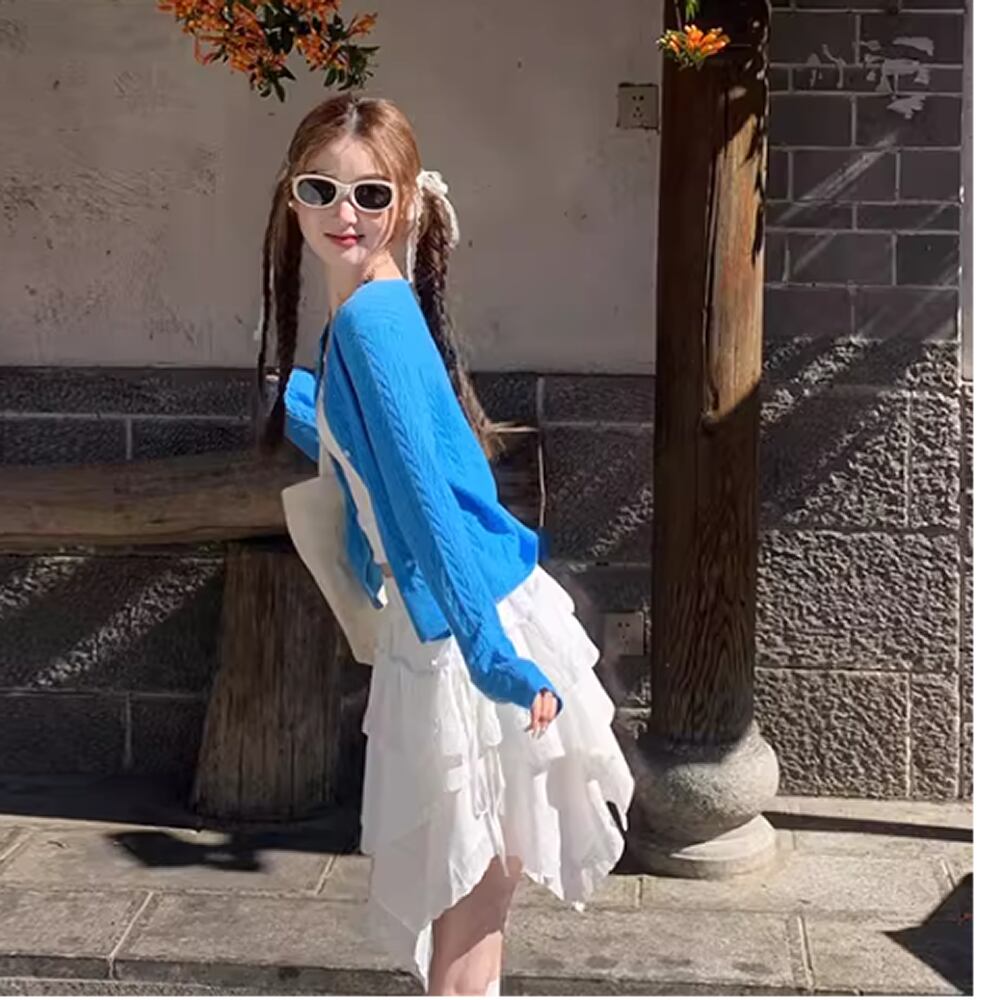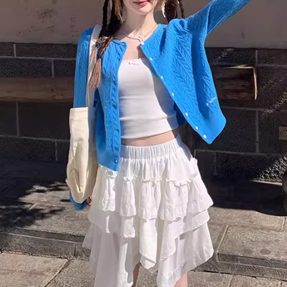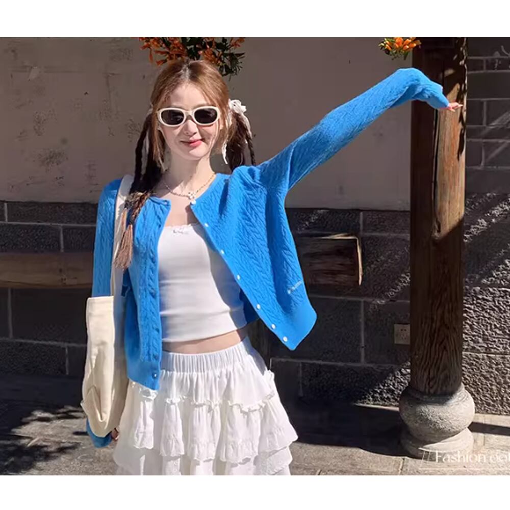 レディース 長袖 トップス ショート丈 ニット カーディガンブルー AS12967