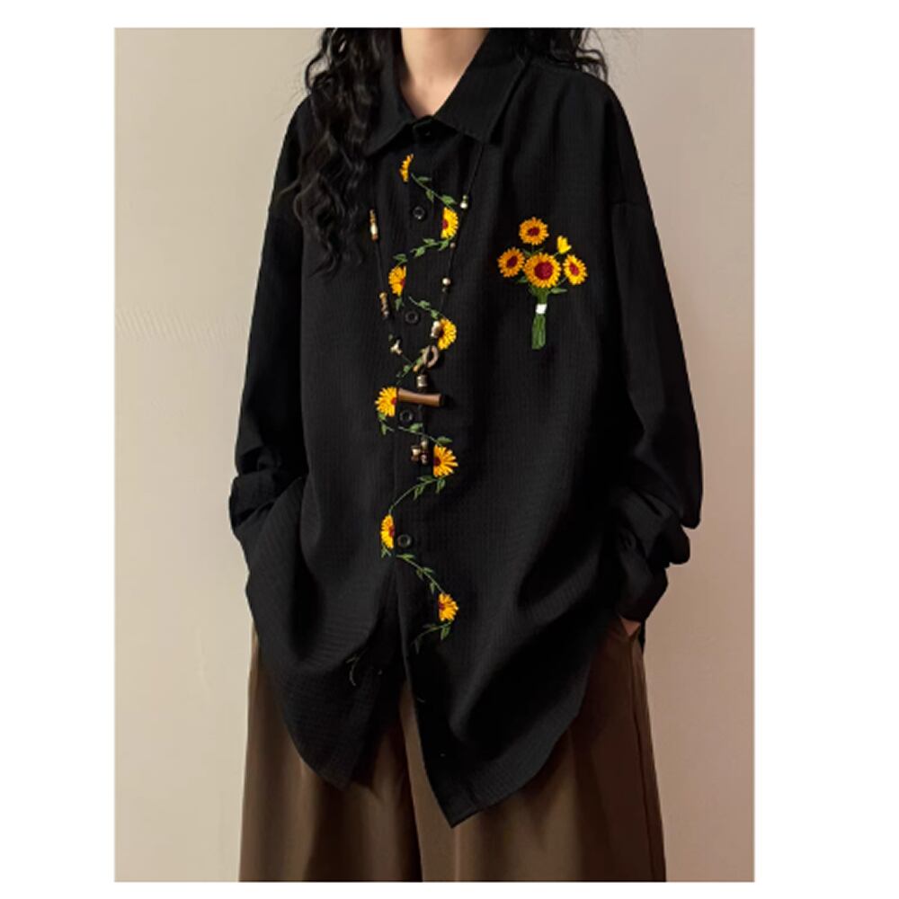 レディース 長袖 トップス ロング丈 シャツ ひまわり刺繍 ブラック ホワイト AS12969