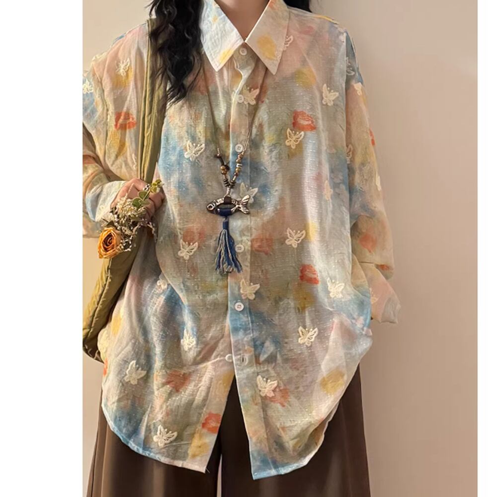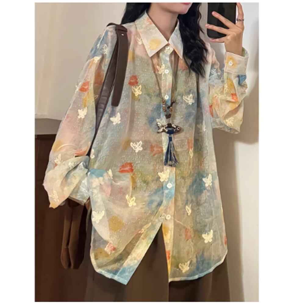 レディース 長袖 トップス ロング丈 シャツ 蝶刺繍 シアー 透け感 AS12970