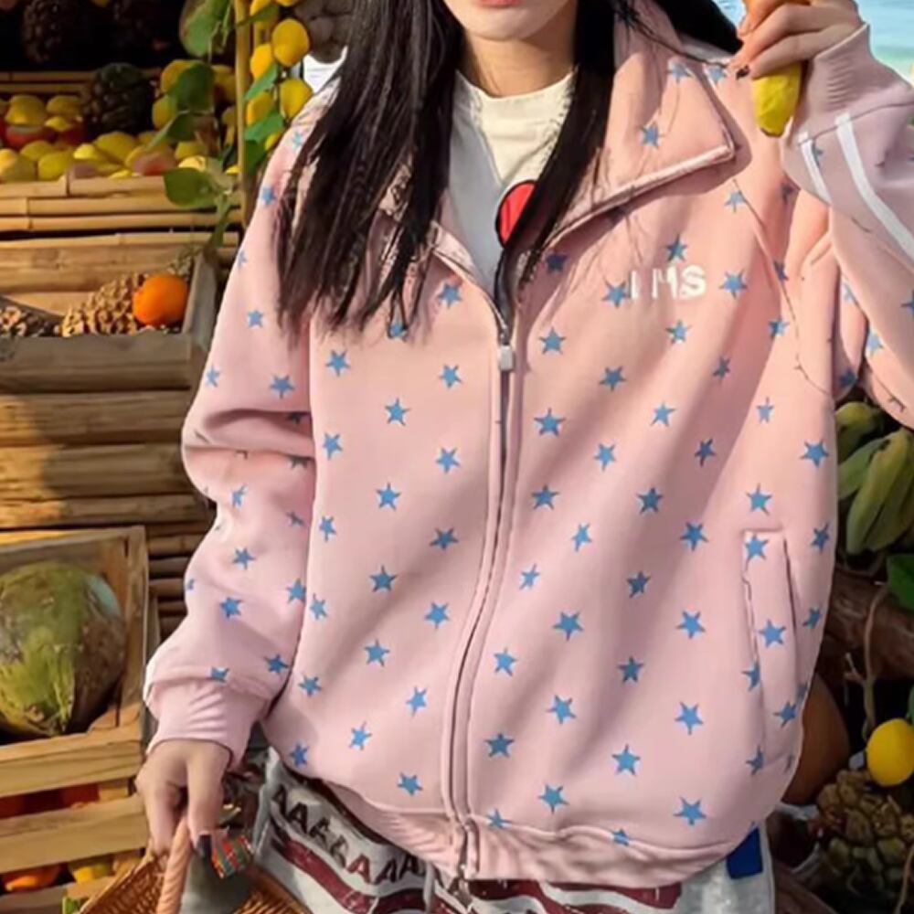 レディース 星柄 スウェット トップス 長袖 フロントジッパー ピンク AS12979