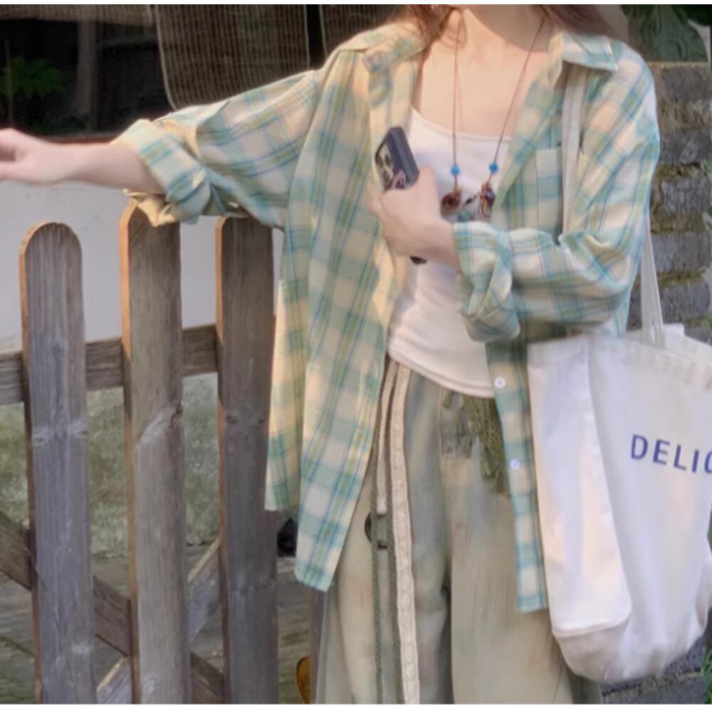レディース グリーン チェック柄 長袖 トップス シャツ AS12983