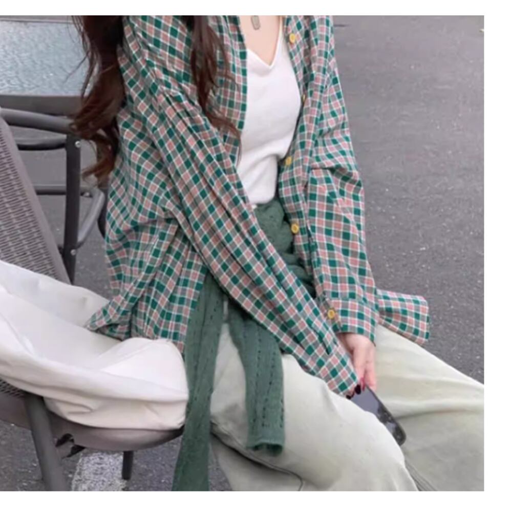 レディース チェック柄 トップス 長袖 シャツ グリーン ロング丈 AS12998