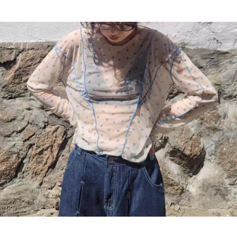 レディース リボン柄 トップス 長袖 シアー Tシャツ 透け感 AS13002