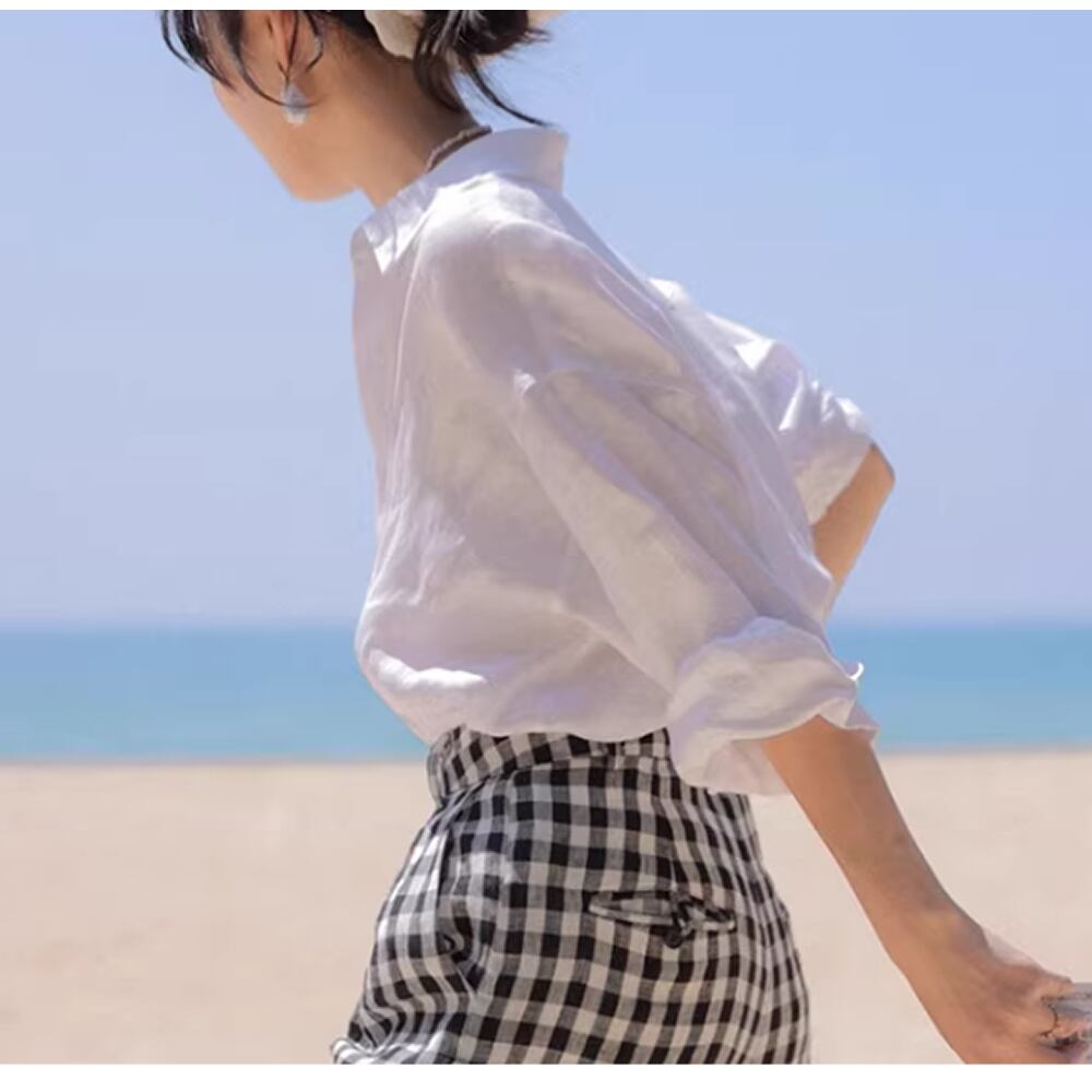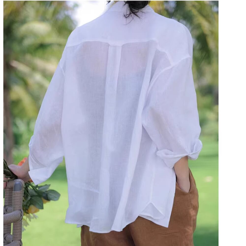 レディース コットンリネン 無地 トップス シャツ 長袖 ブルー ホワイト AS13014