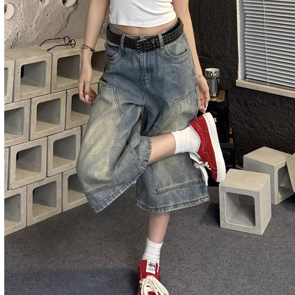 クロップド丈のデニムパンツ。