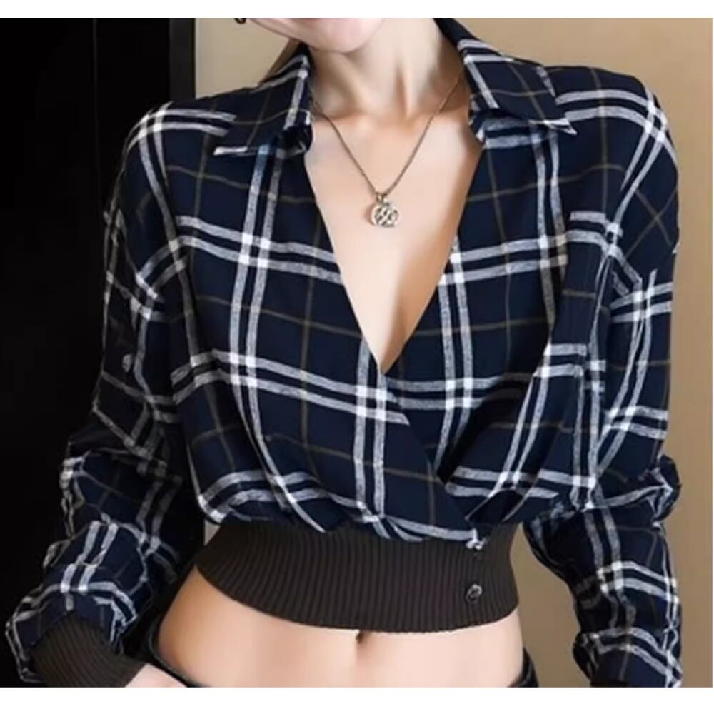 レディース チェック柄 トップス 長袖 ショート丈 Vネック シャツ ネイビー AS13036