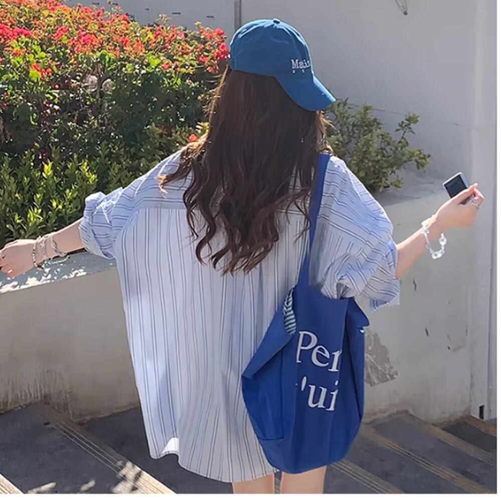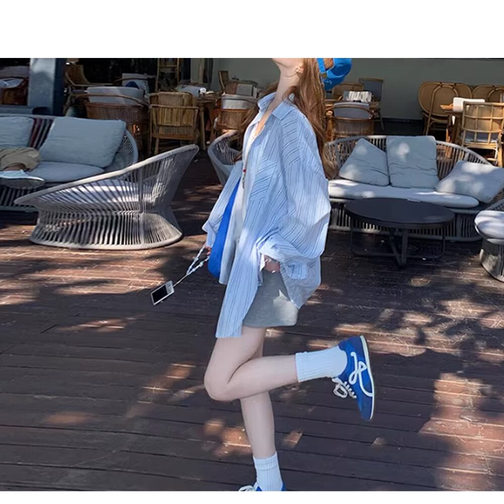 レディース ストライプ柄 トップス シャツ 長袖 ロング丈 ブルー AS13052