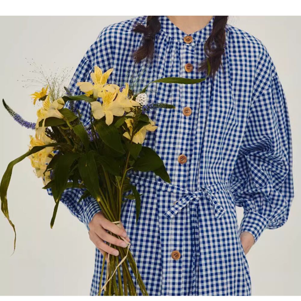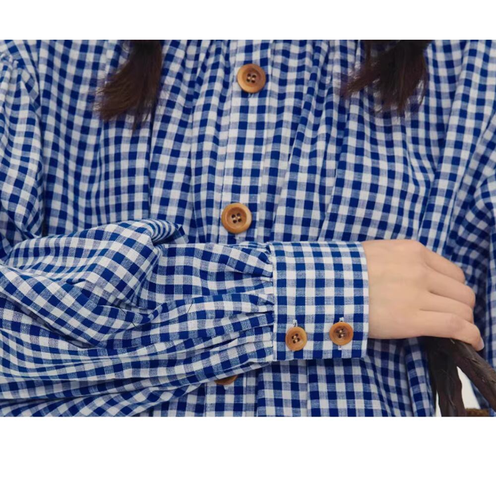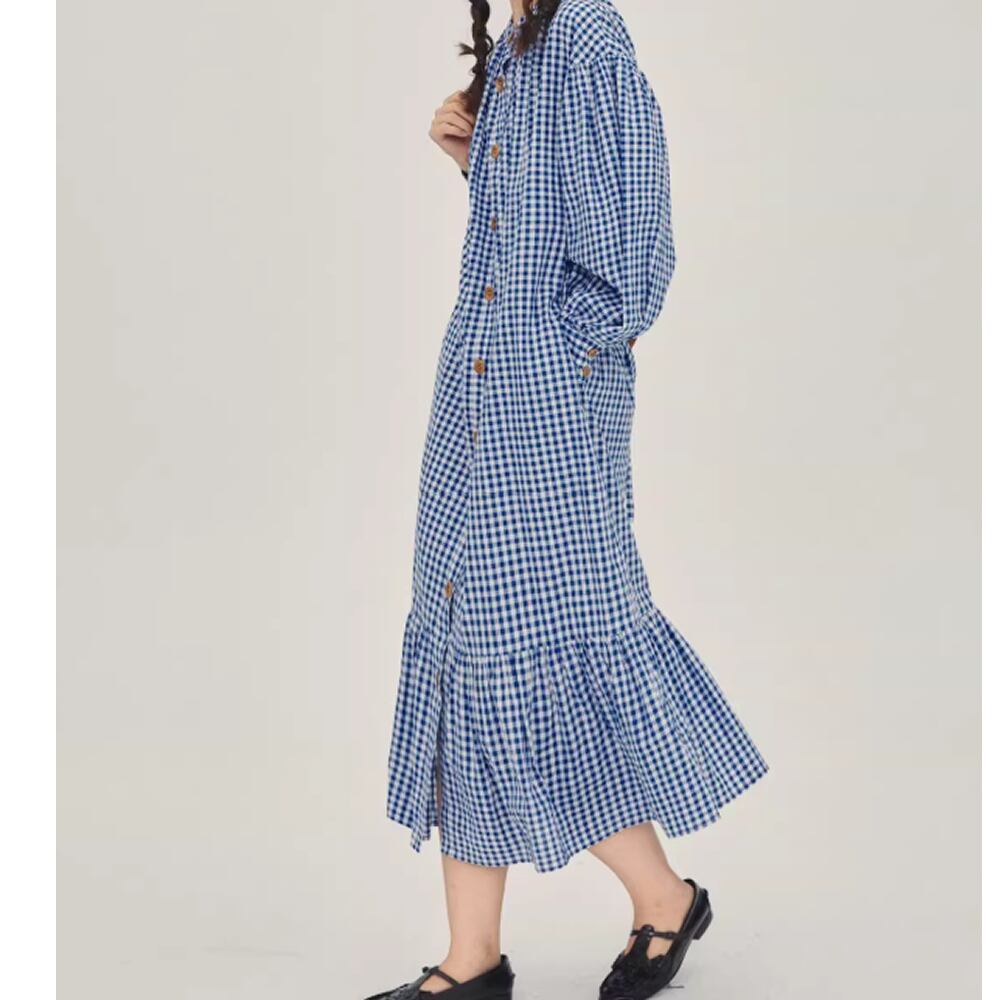 レディース チェック柄 ロングワンピース 長袖 ブルー AS13067