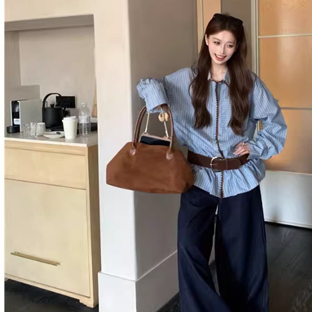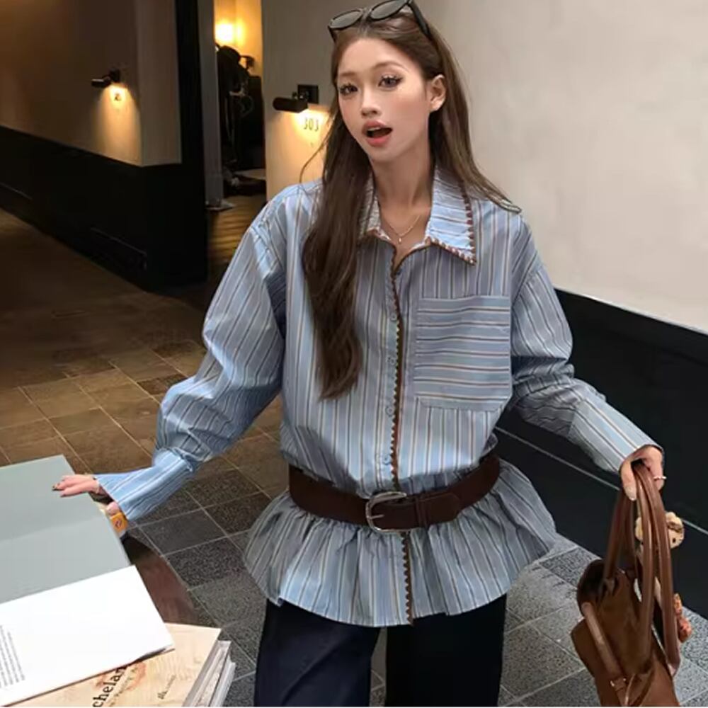 レディース ストライプ柄 トップス シャツ ロング丈 長袖 ブルー AS13071