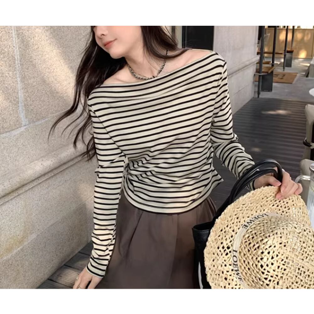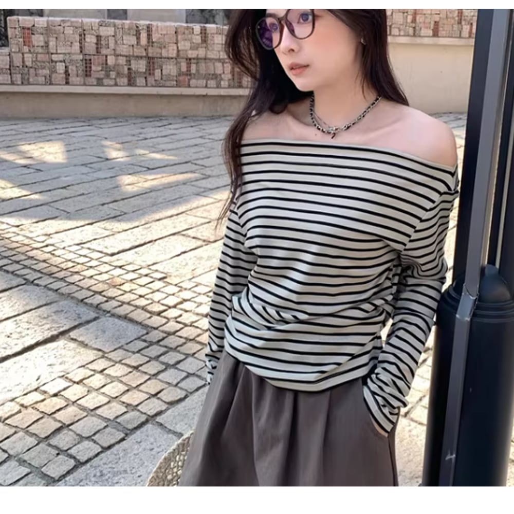 レディース ボーダー柄 トップス カットソー 長袖 オフショルダー AS13074