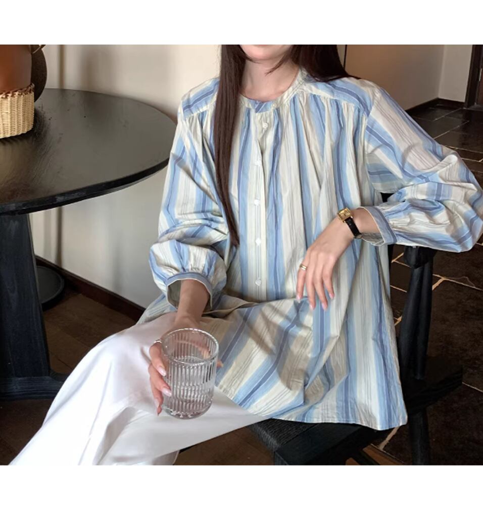 レディース ストライプ柄 トップス ブラウス 長袖 ブルー AS13110