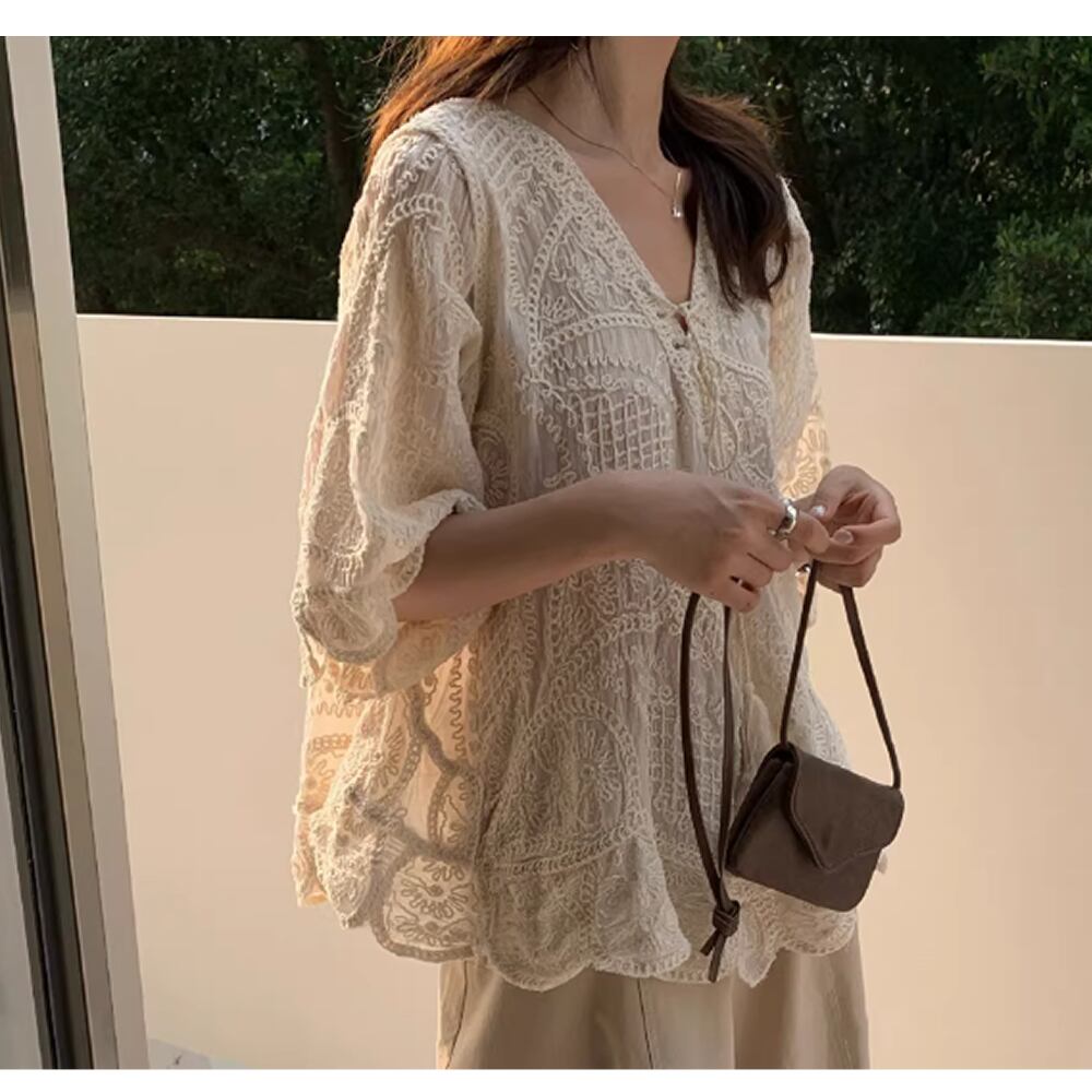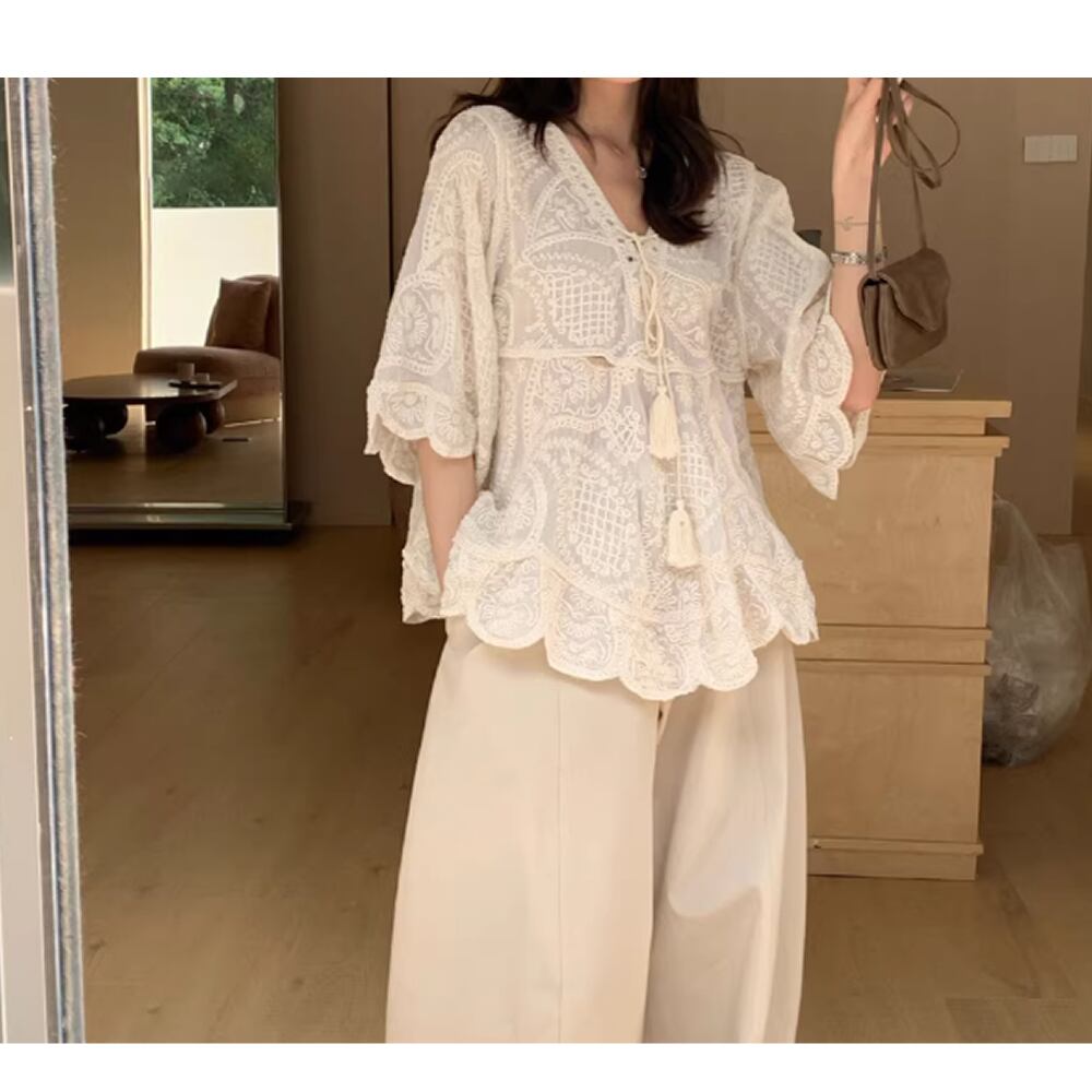 レディース ボヘミアン風 刺繍 トップス 半袖アプリコット AS13115