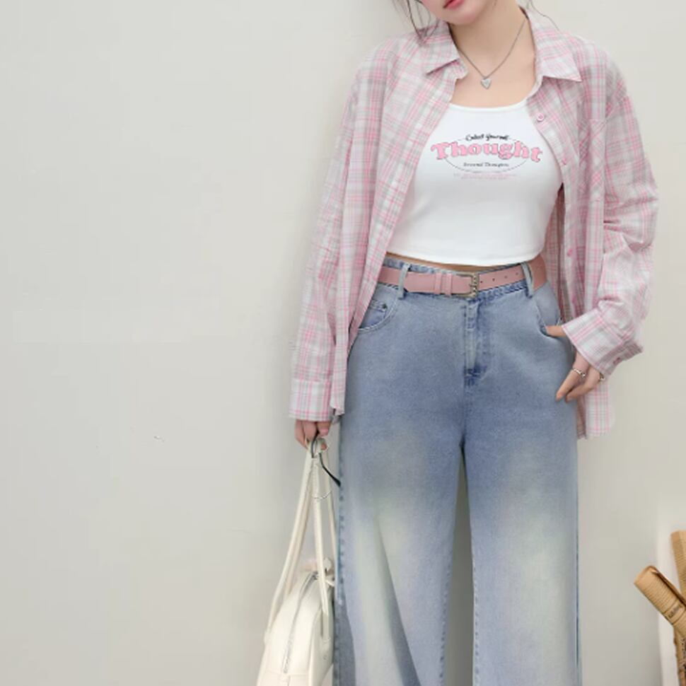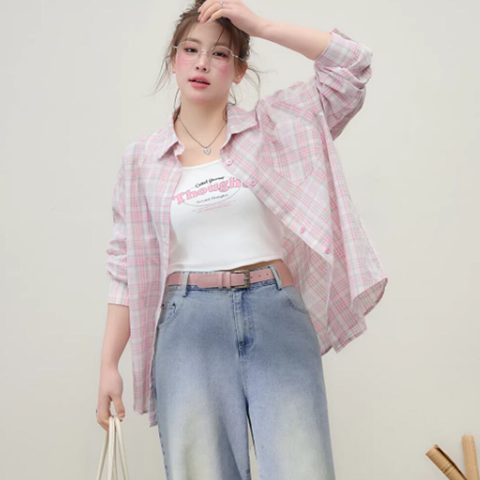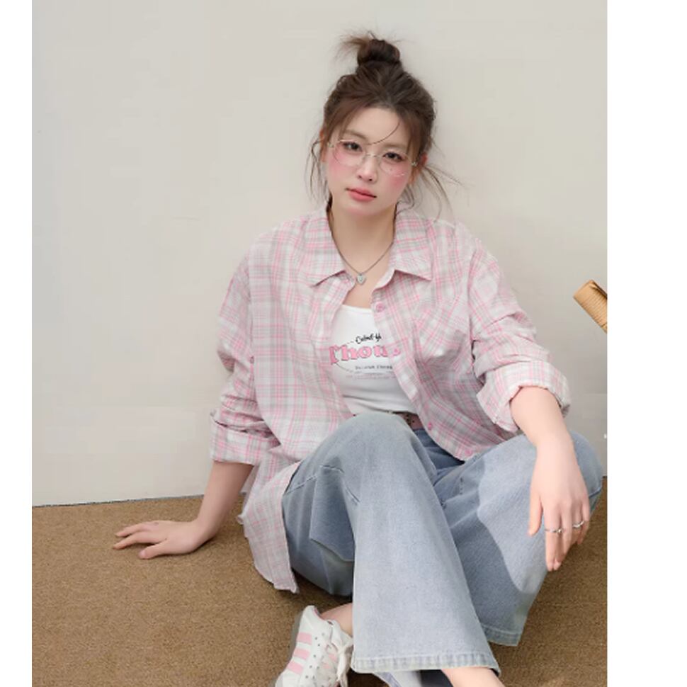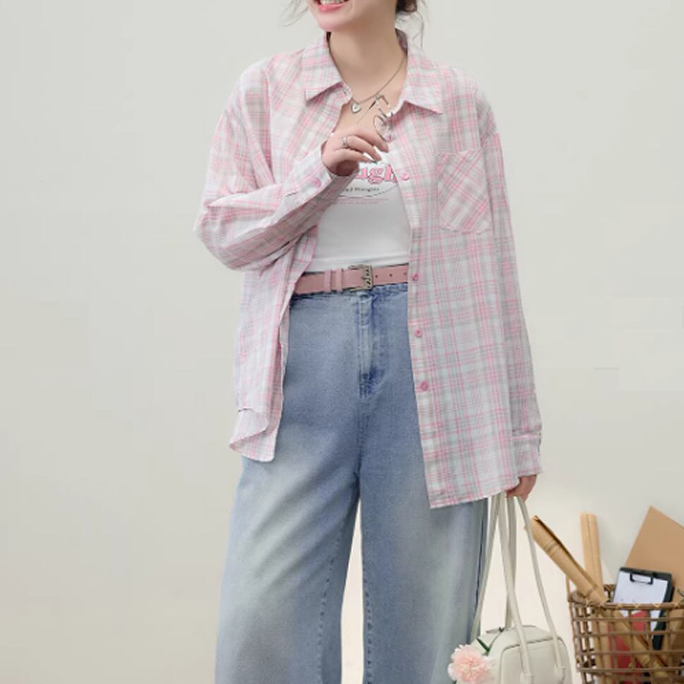 レディース チェック柄 長袖 トップス ピンク シャツ ロング丈 大きいサイズ AS13127
