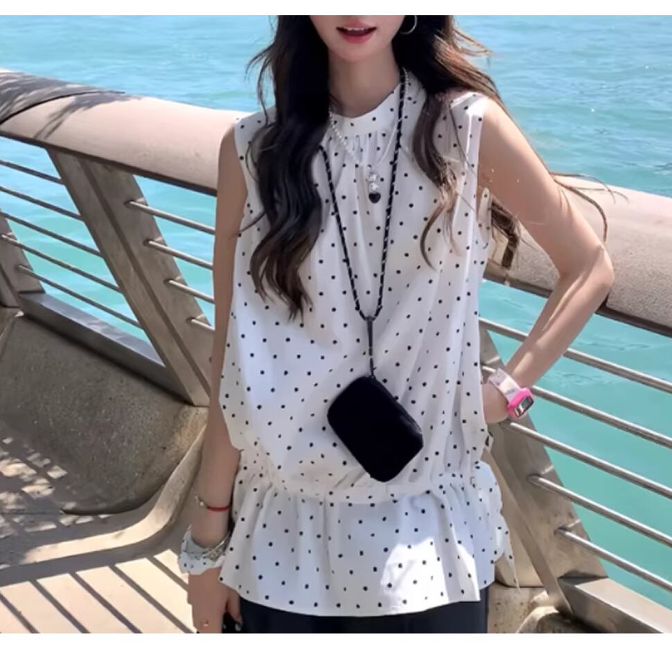 ドット柄のノースリーブトップス。