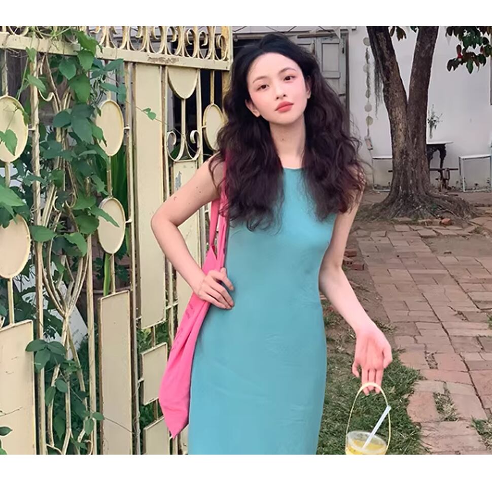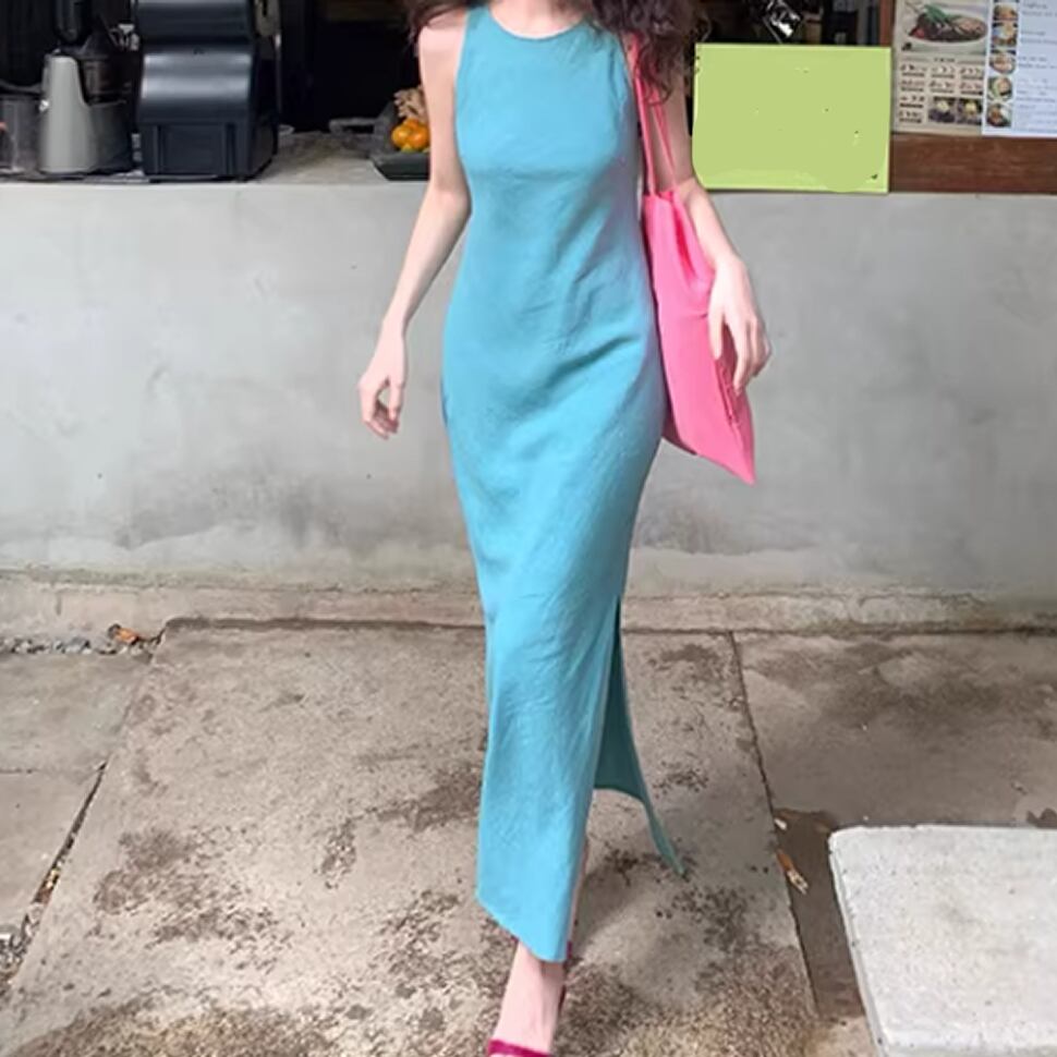 レディース 無地 ロングワンピース ノースリーブ サイドスリット AS13133