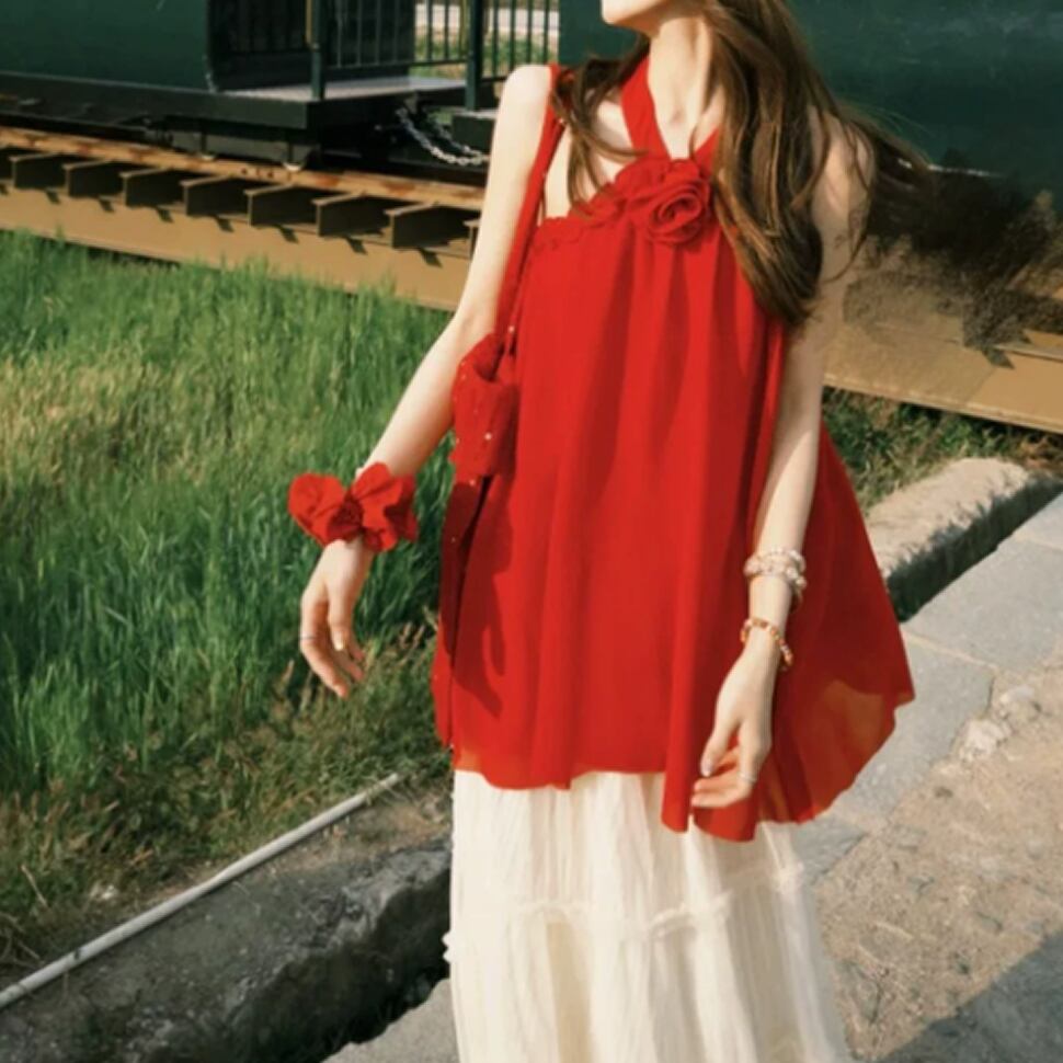 レディース ホルターネック ノースリーブ トップス レッド AS13141