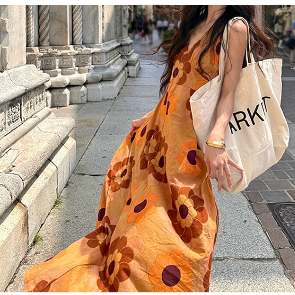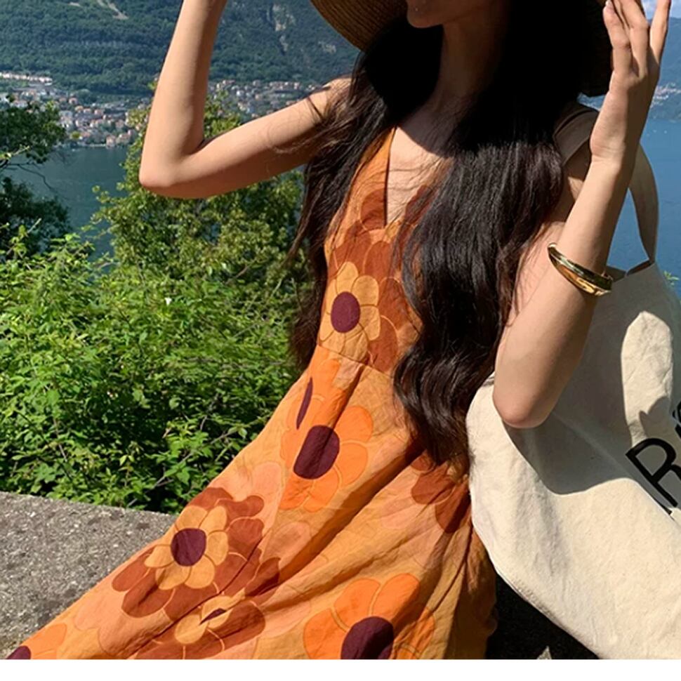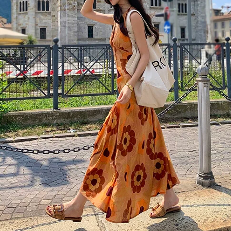 レディース ノースリーブ ワンピース ロング丈 花柄 オレンジ AS13144