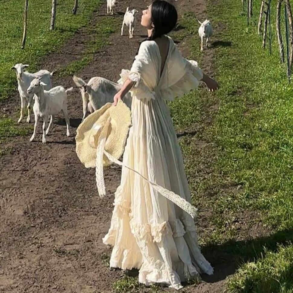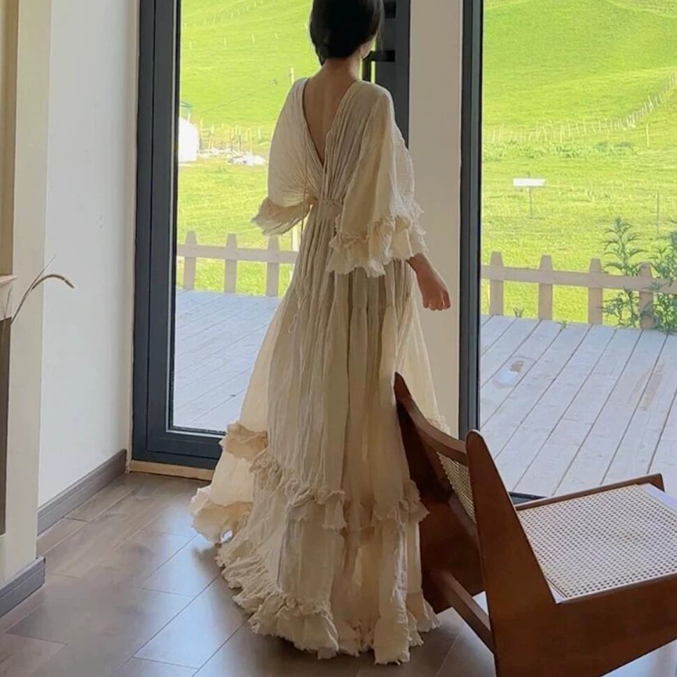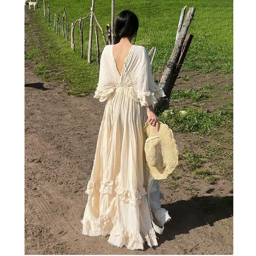 ボヘミアン風の背中空きロングワンピース。