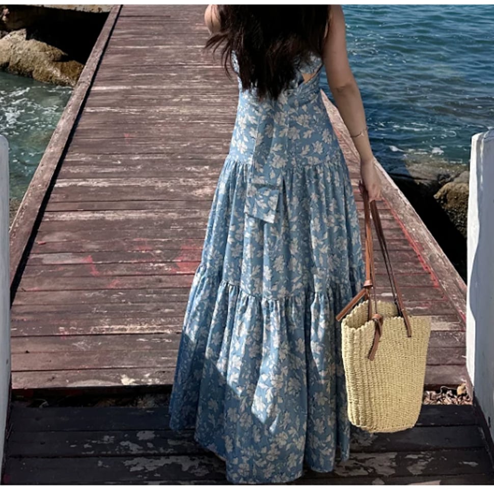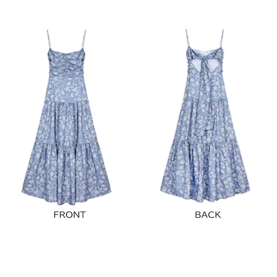 背中空きの花柄キャミソールワンピース。