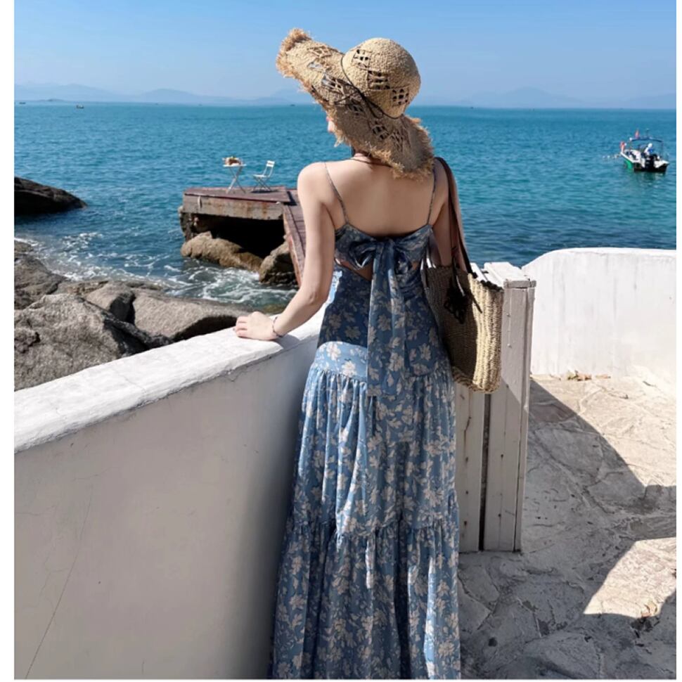 レディース 花柄 キャミソール ワンピース ロング丈 ブルー AS13149