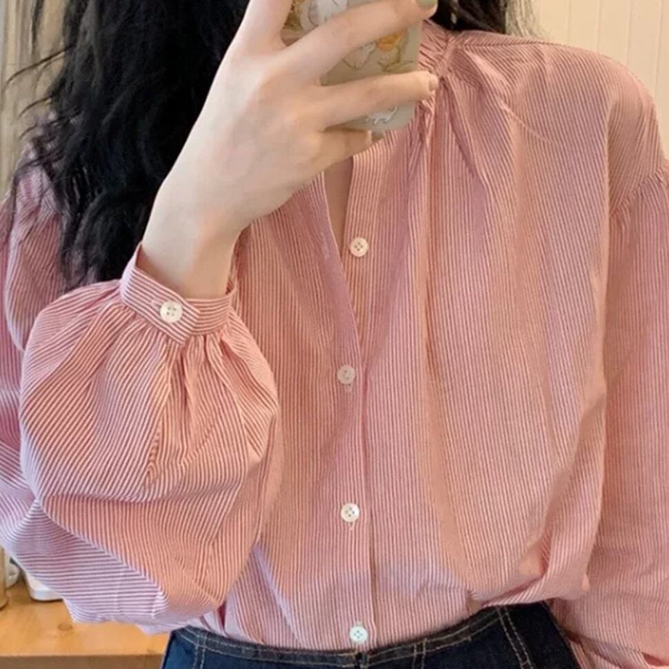 レディース ストライプ柄 長袖 トップス ブラウス ピンク AS13171