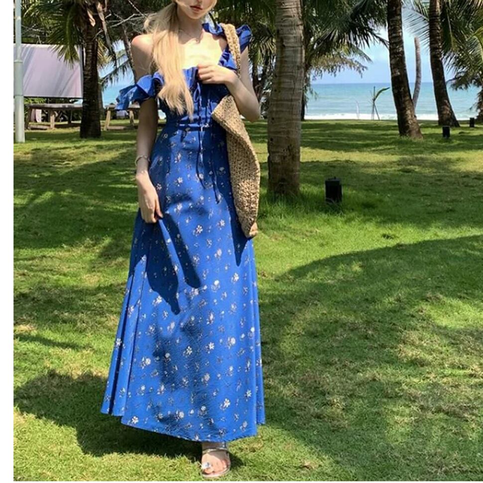 レディース 花柄 ノースリーブ ワンピース ロング丈 ブルー AS13173